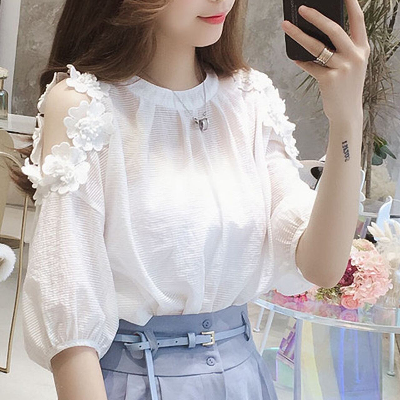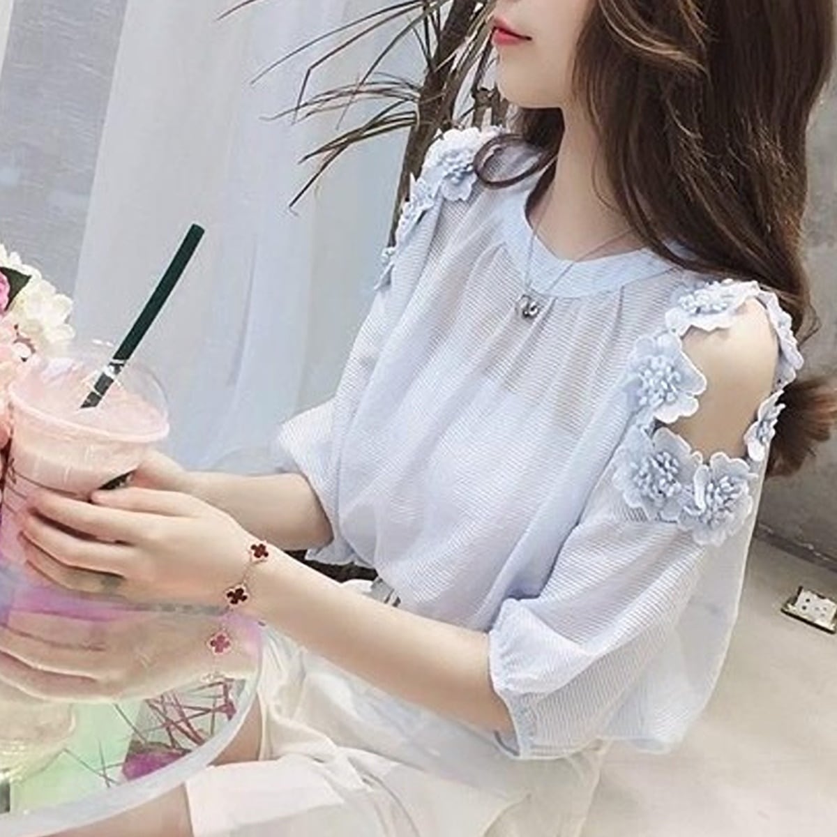2カラ― フラワーオープンショルダー シフォンブラウス S - 3XL *003
