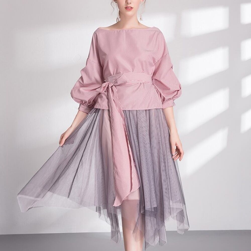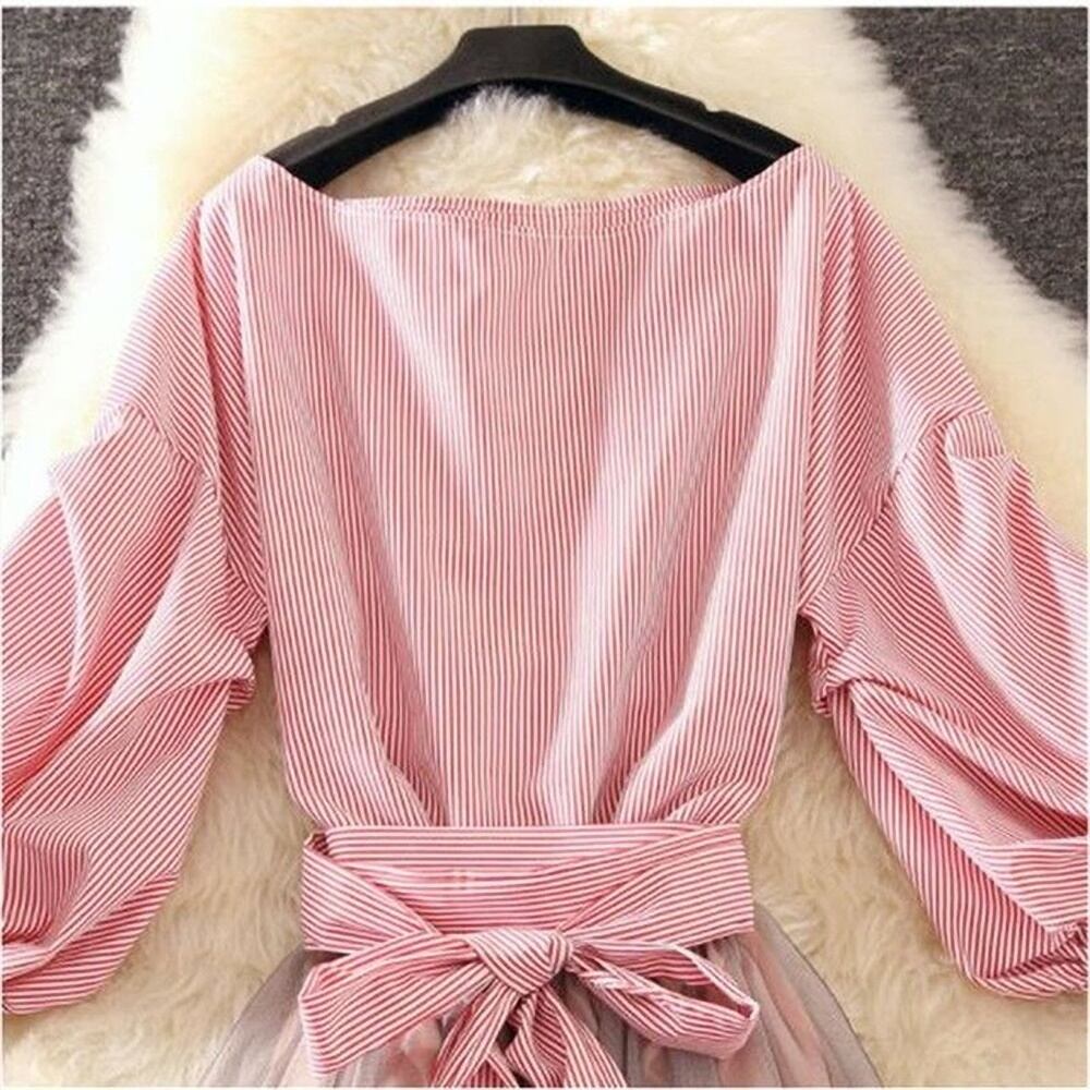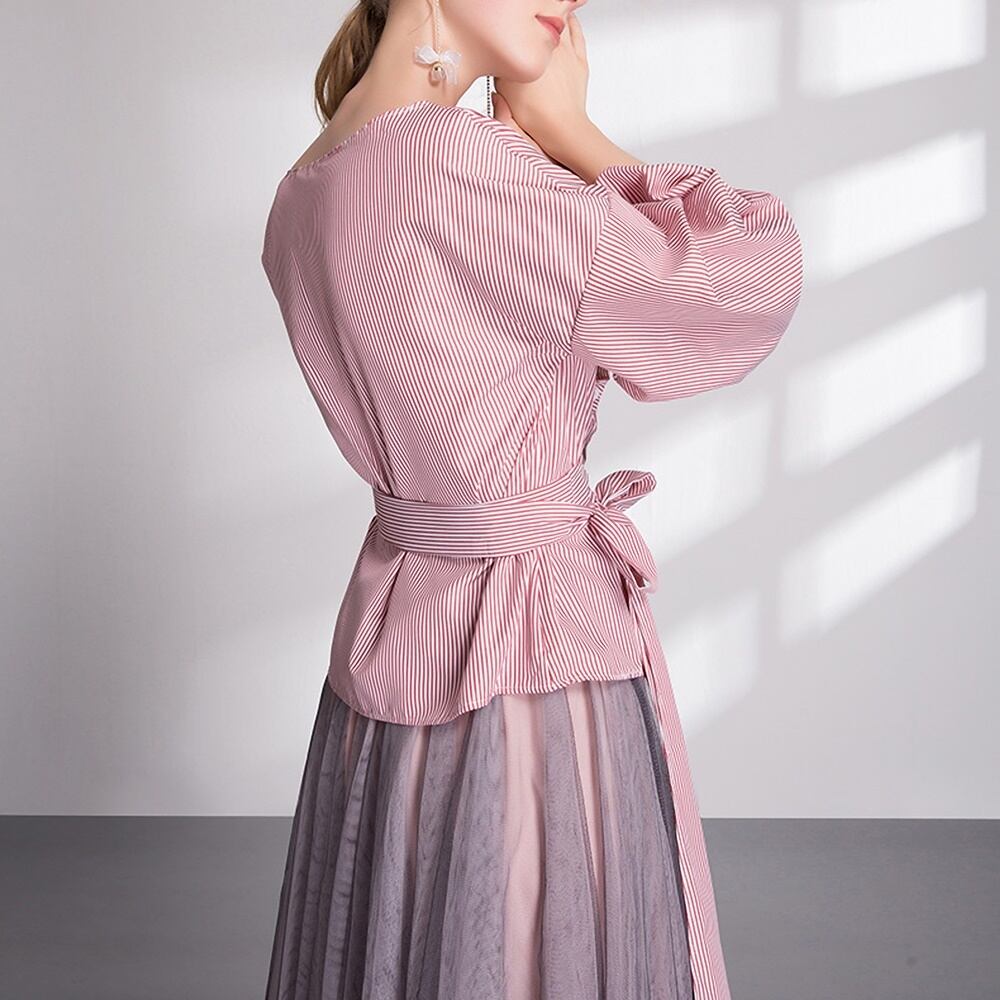 セットアップ ストライプブラウス チュールワンピース S ‐ 2XL *012
