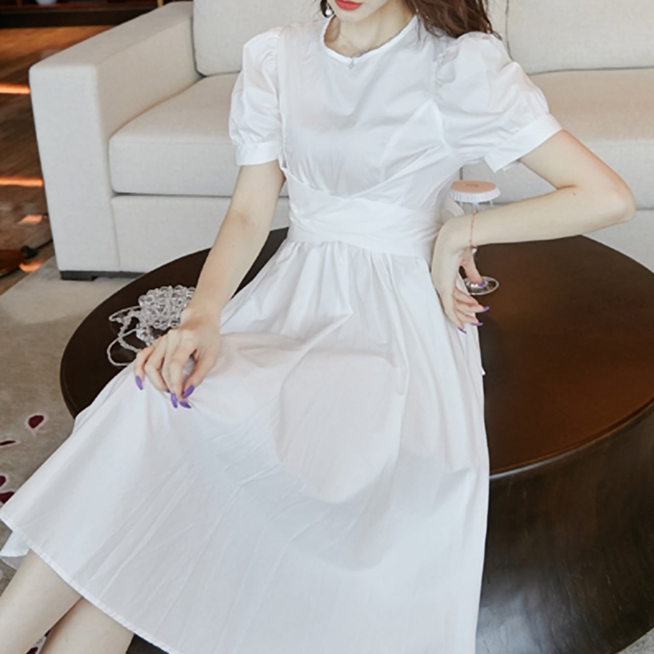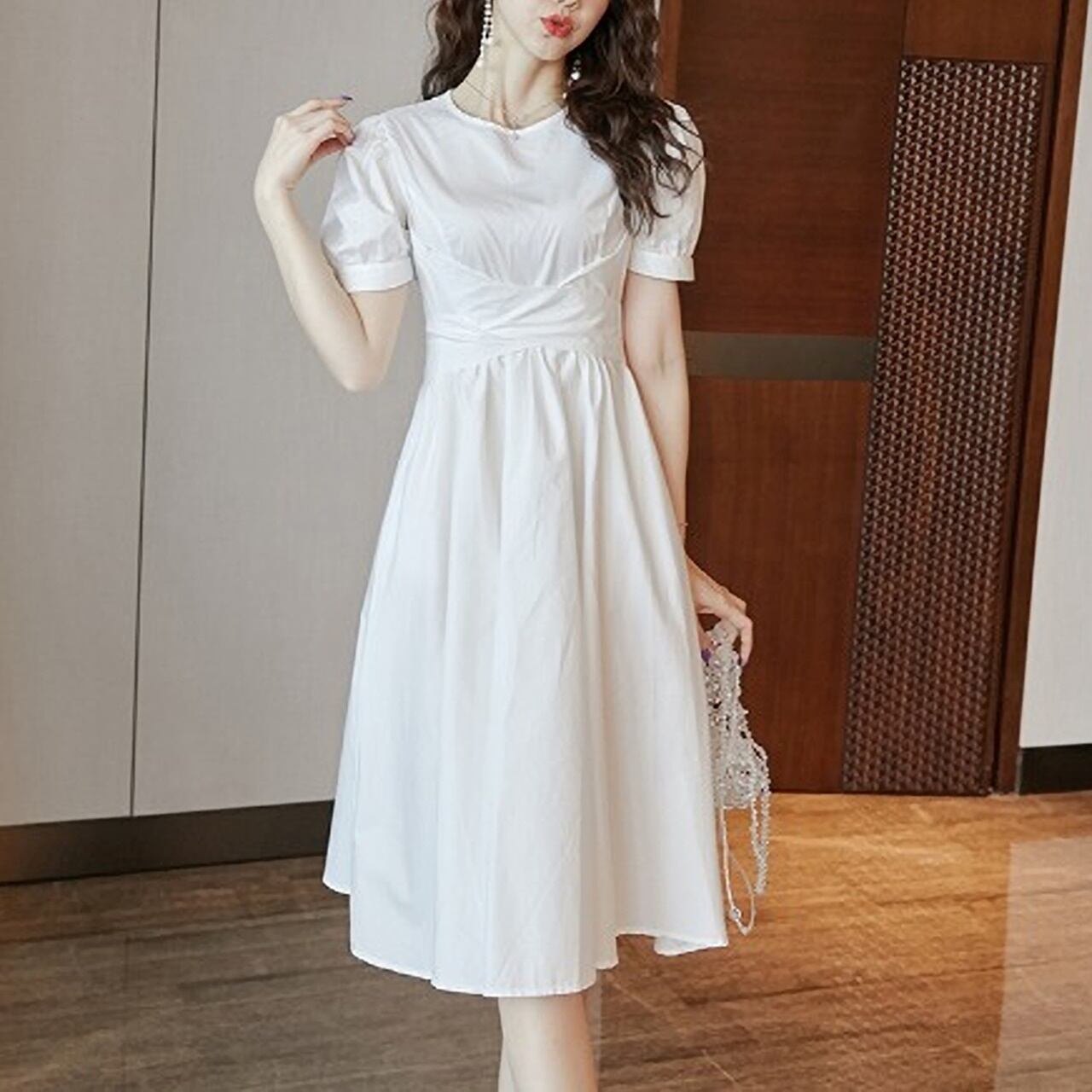 2カラー レトロバブルスリーブ フレアワンピース S ‐ XL *006
