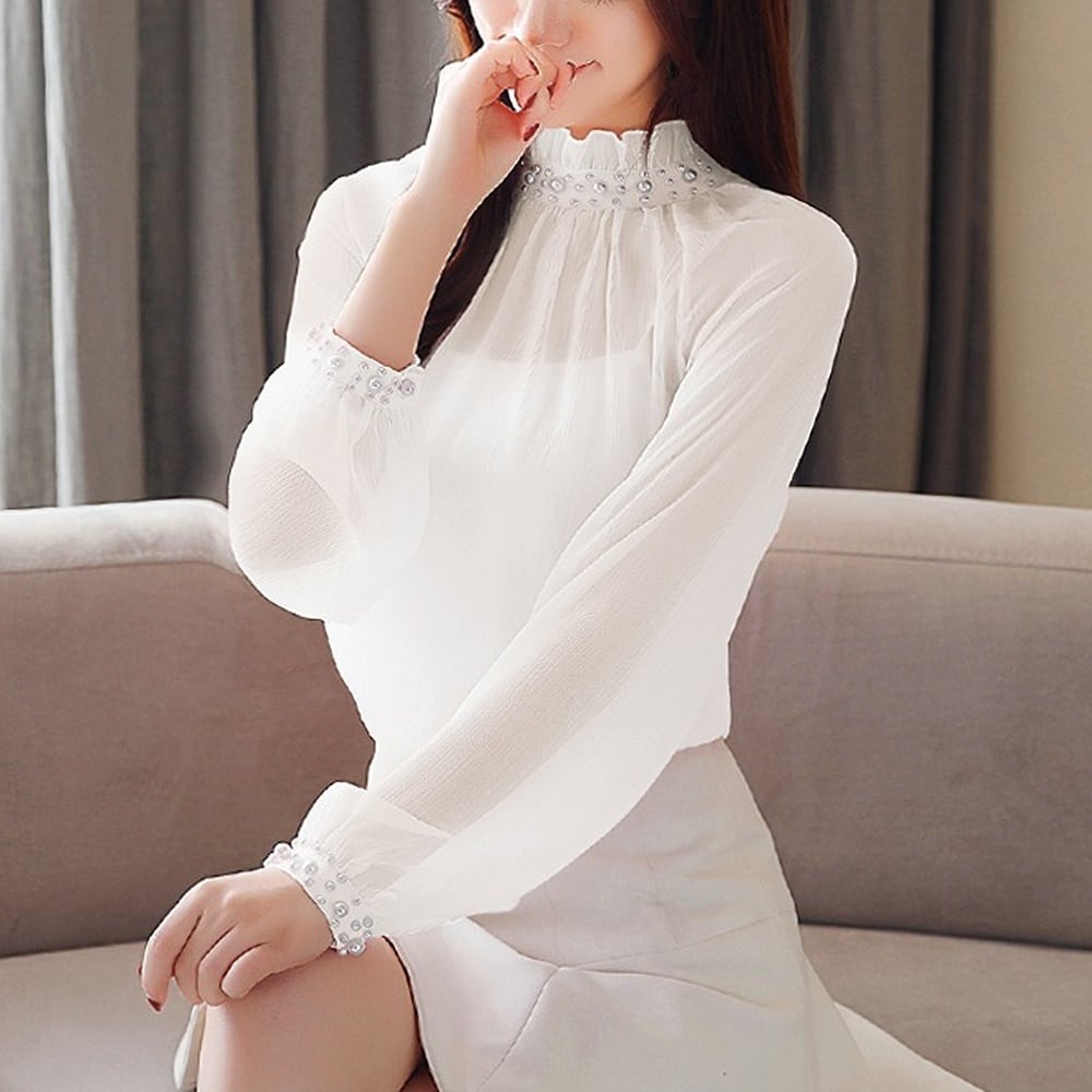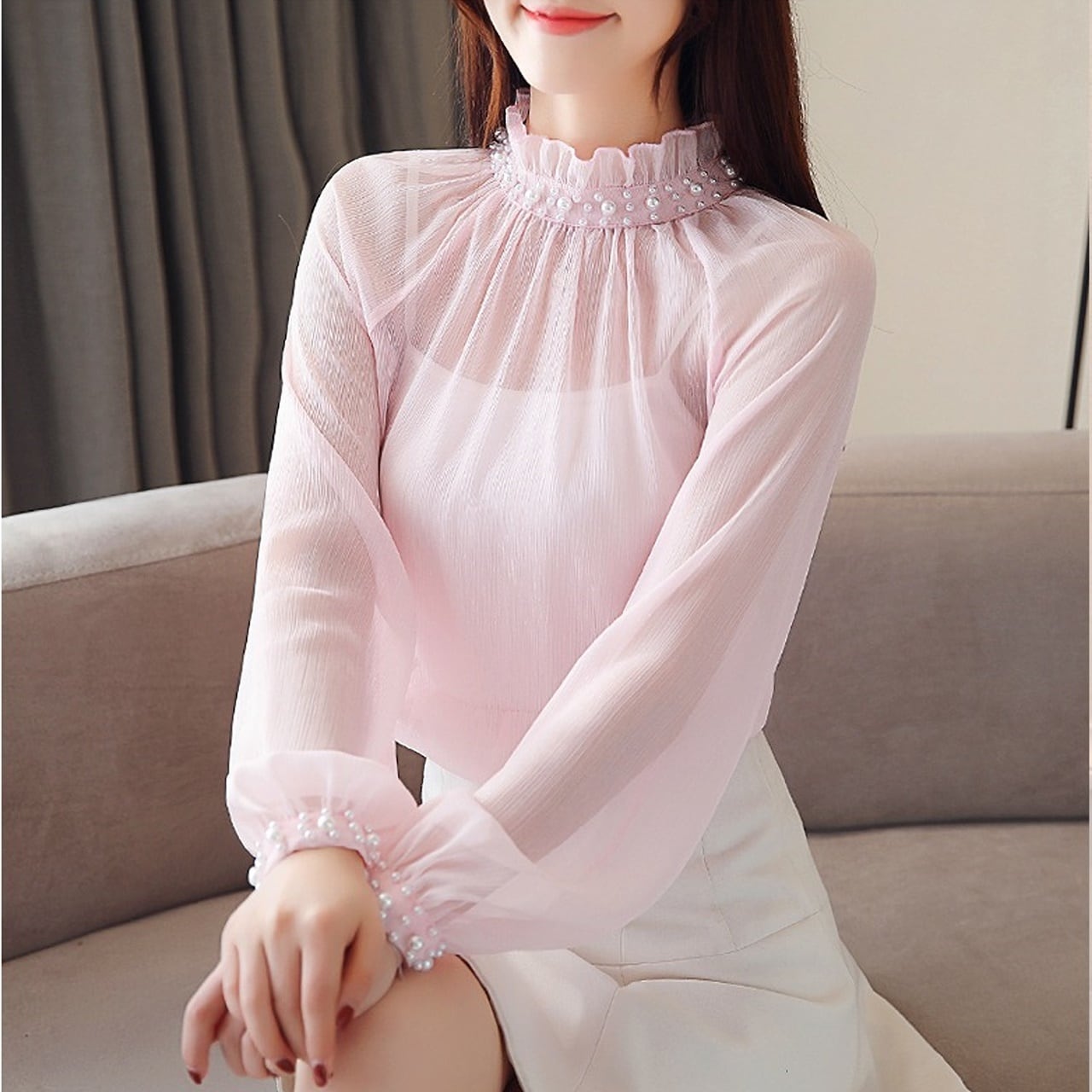 3カラー シアー シフォンブラウス フェイクパール S ‐ 2XL *024