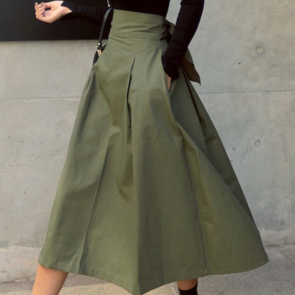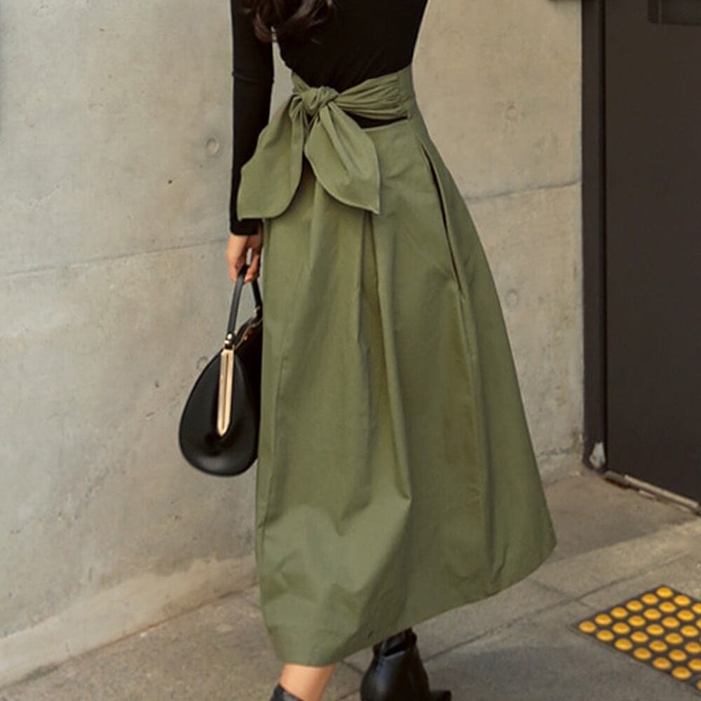 大人の女性らしさを引き立てるミリタリーAラインスカートをウエストバックリボンで可愛く仕上げたキュートな一着です♡