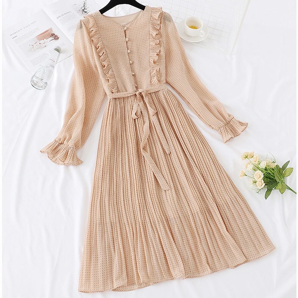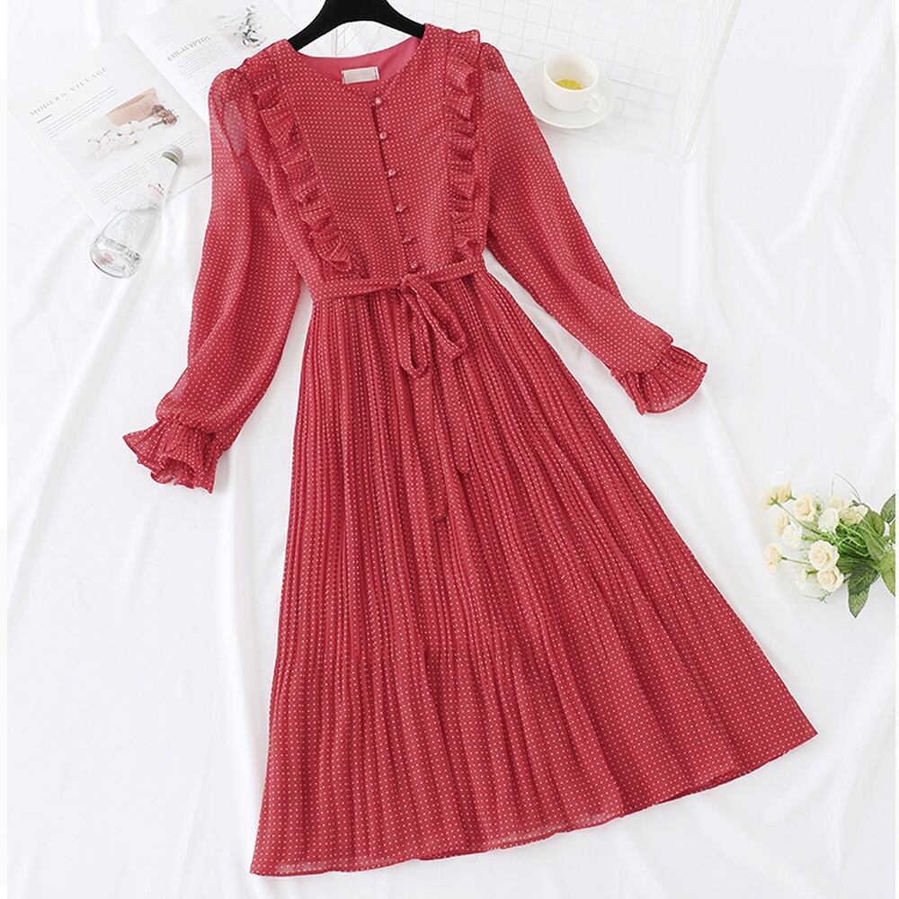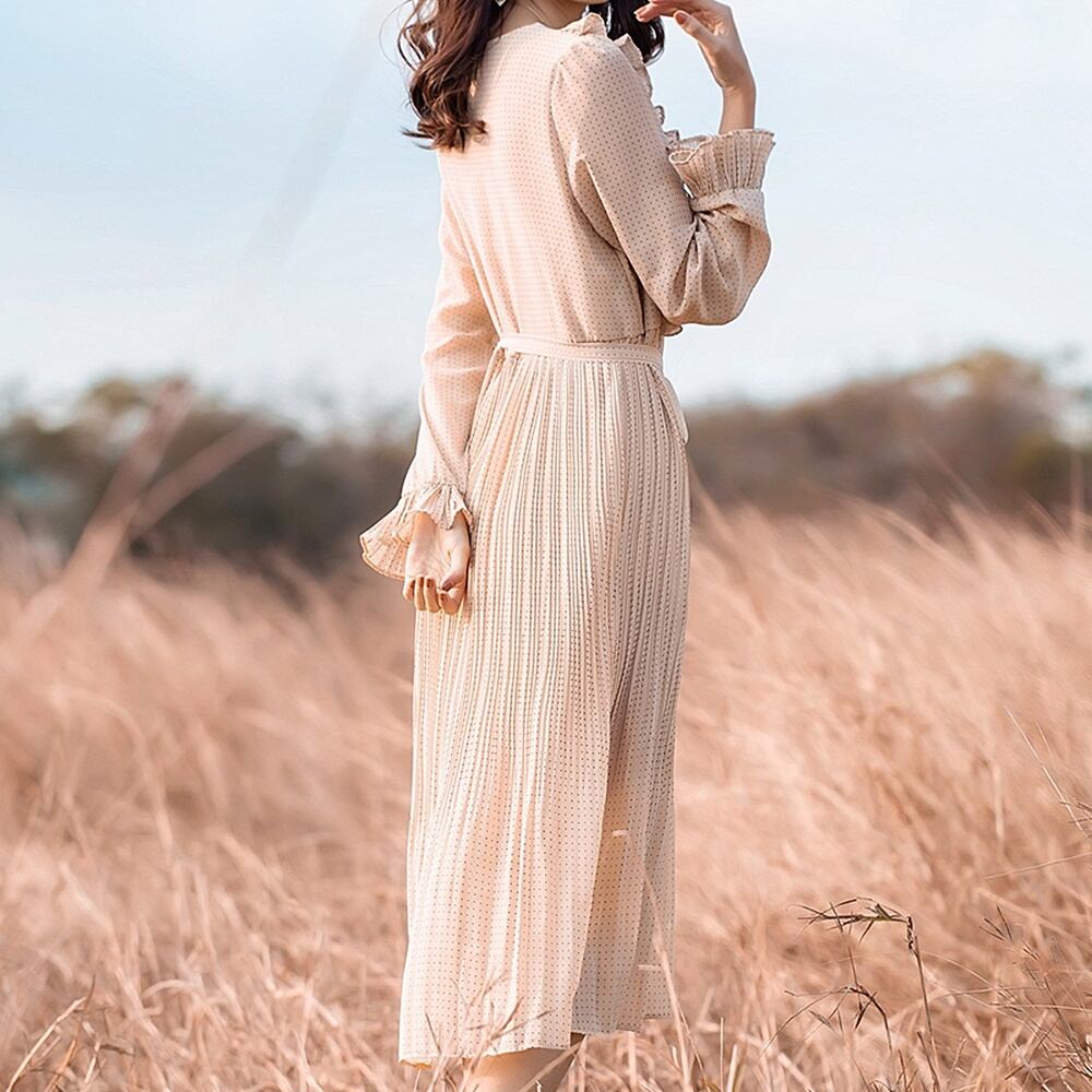 2カラー フレアショルダー ドッドプリーツワンピース S‐XL *034
