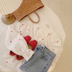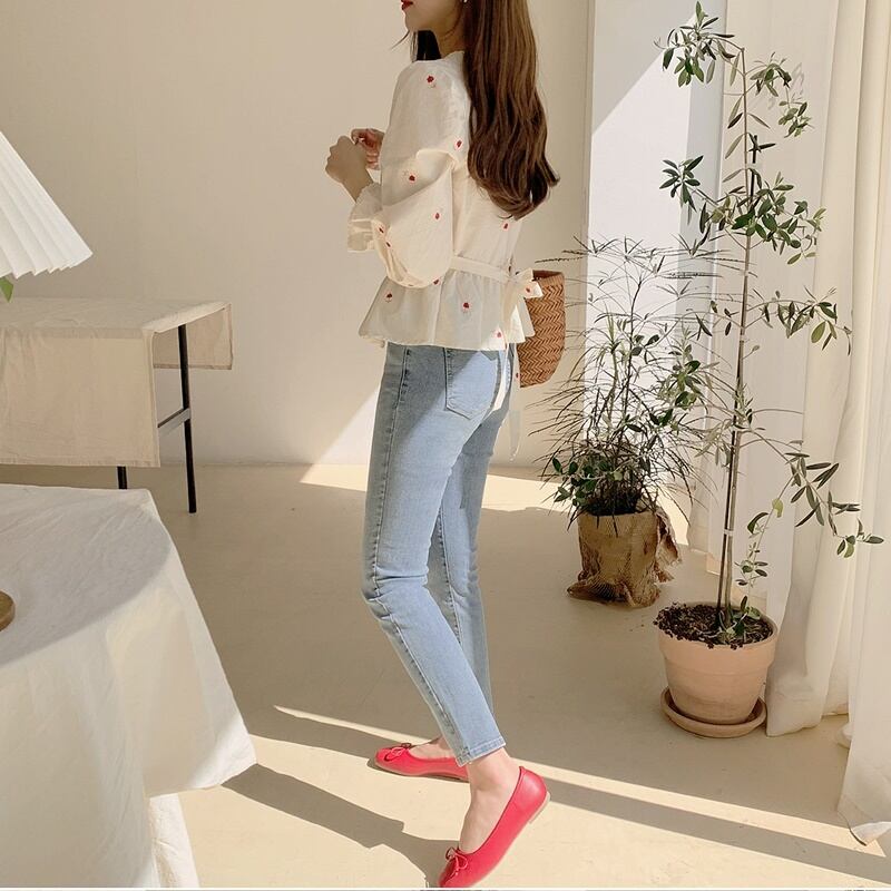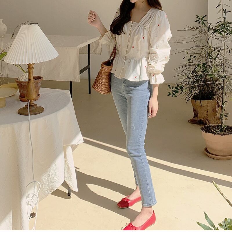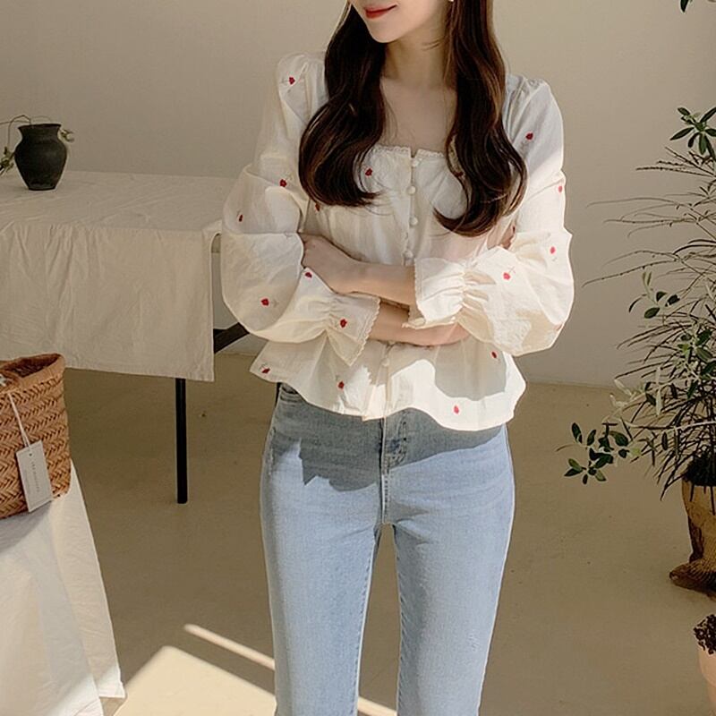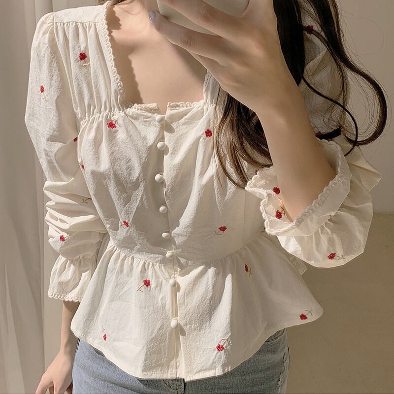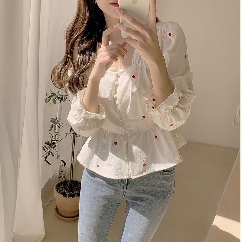 赤いフローラルの刺繍が散りばめられた大人っぽさと上品さを兼ね備えた可愛いブラウス♡
