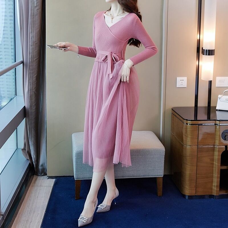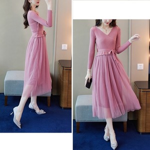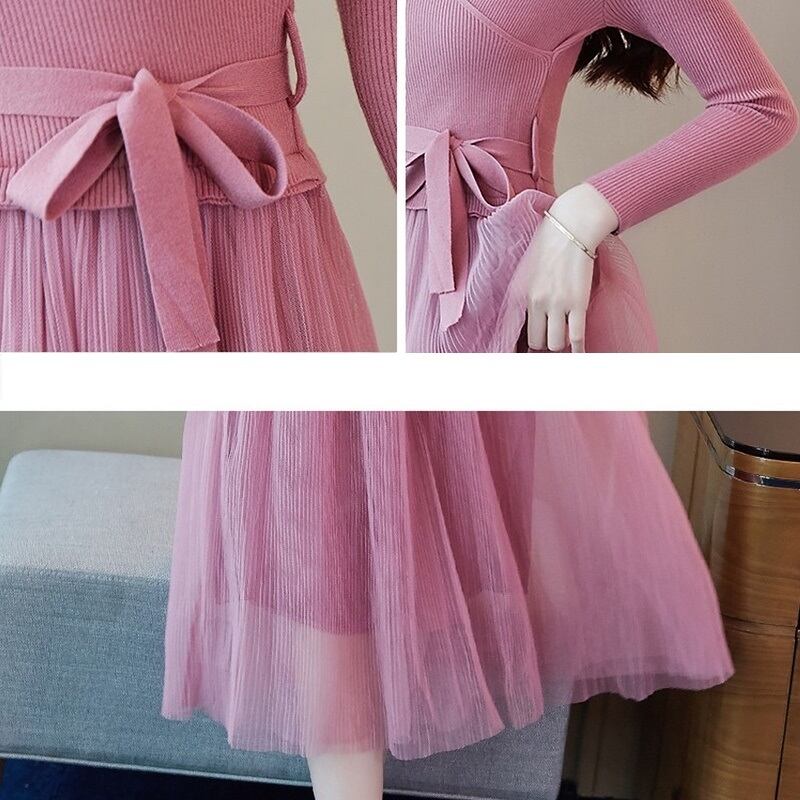 ニットリボンベルトチュールワンピース S‐XL *on024