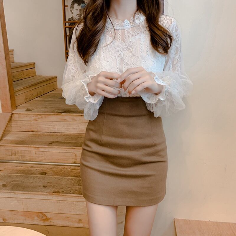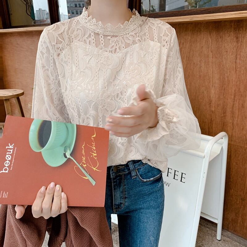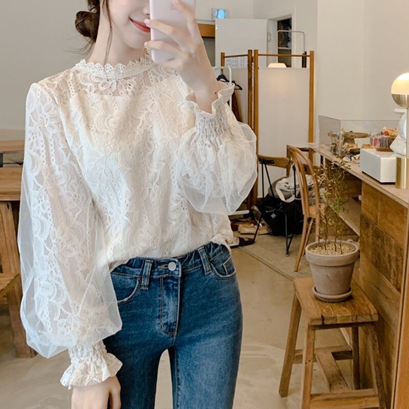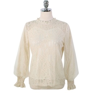 2カラー ランタンスリーブフローラルレースブラウス S-2XL *bl035