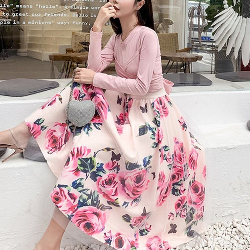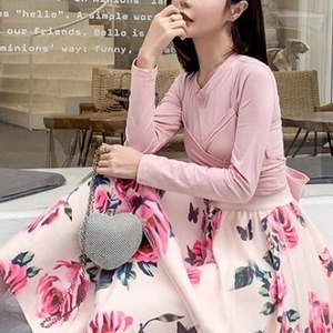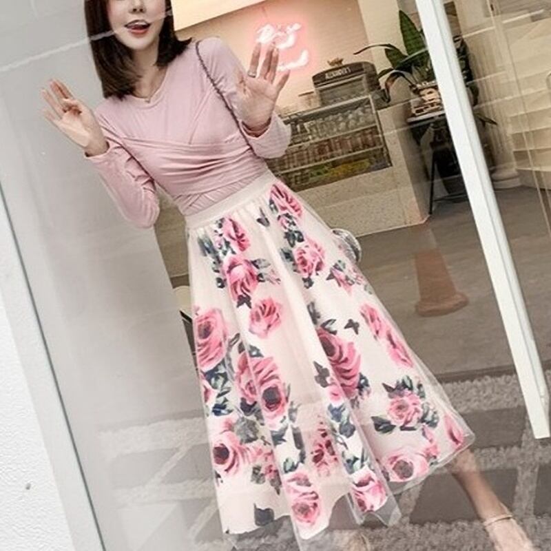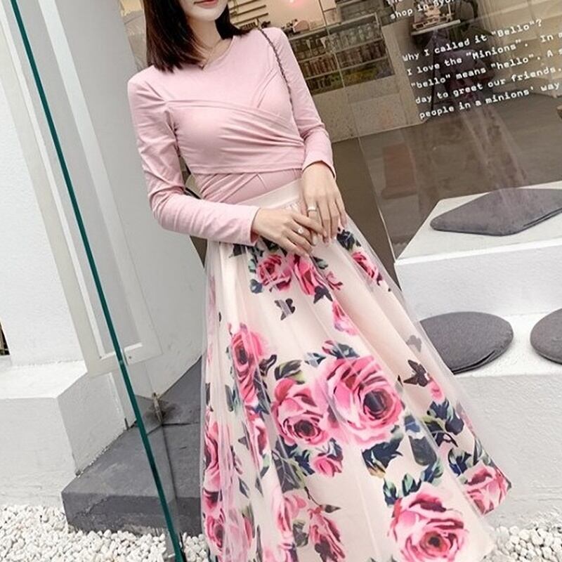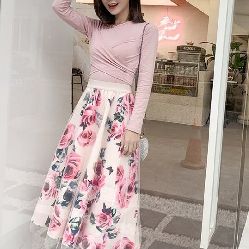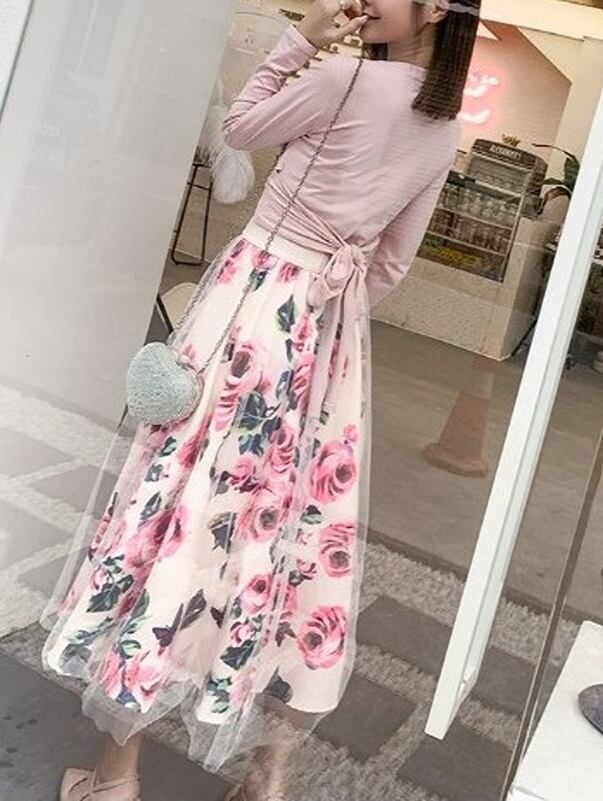 花柄のスカートに無地のレースを重ねることによってふんわりとしてよりフェミニンさを引き立たせたデザイン。