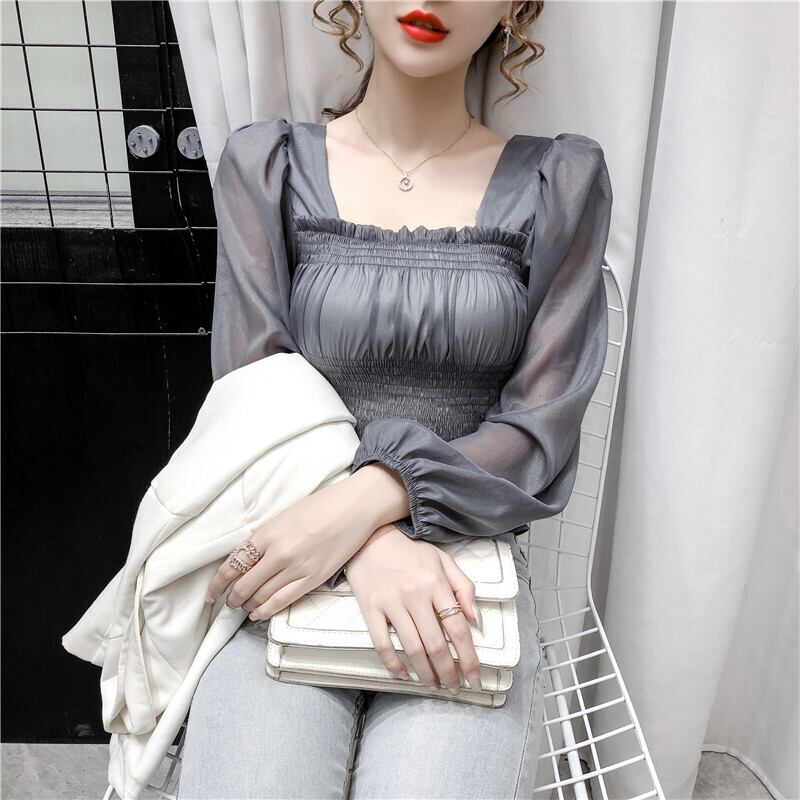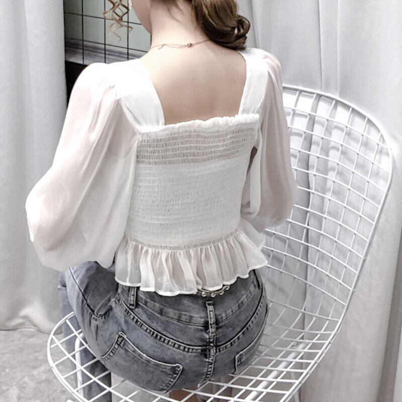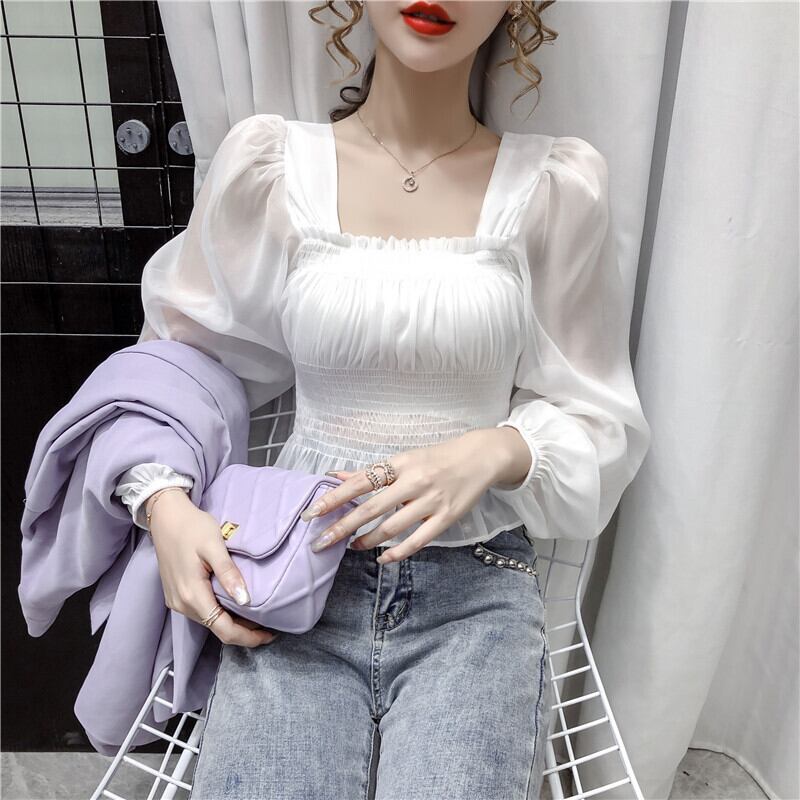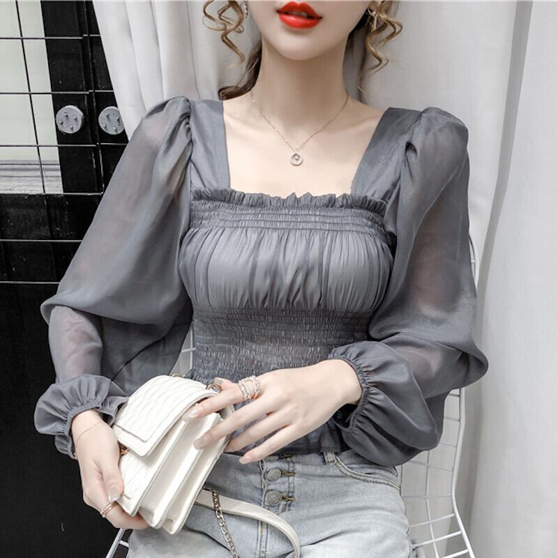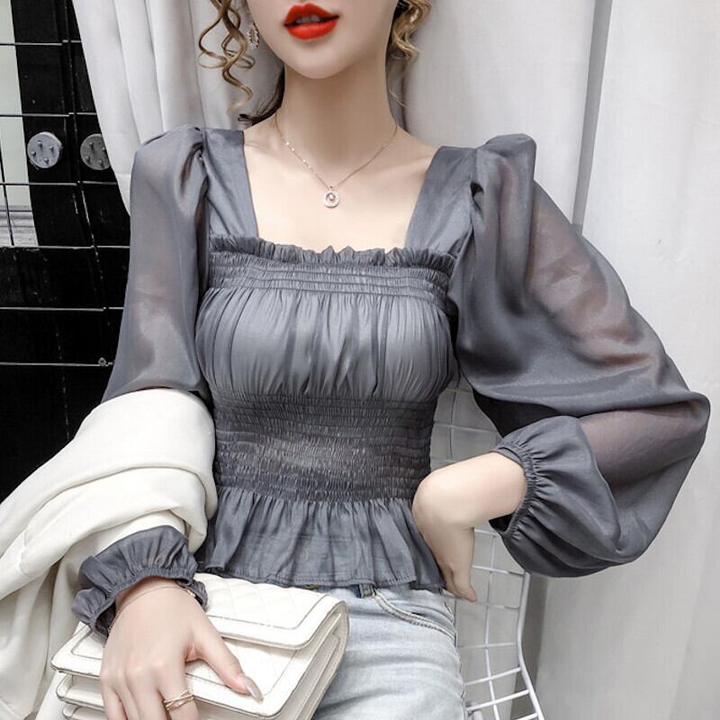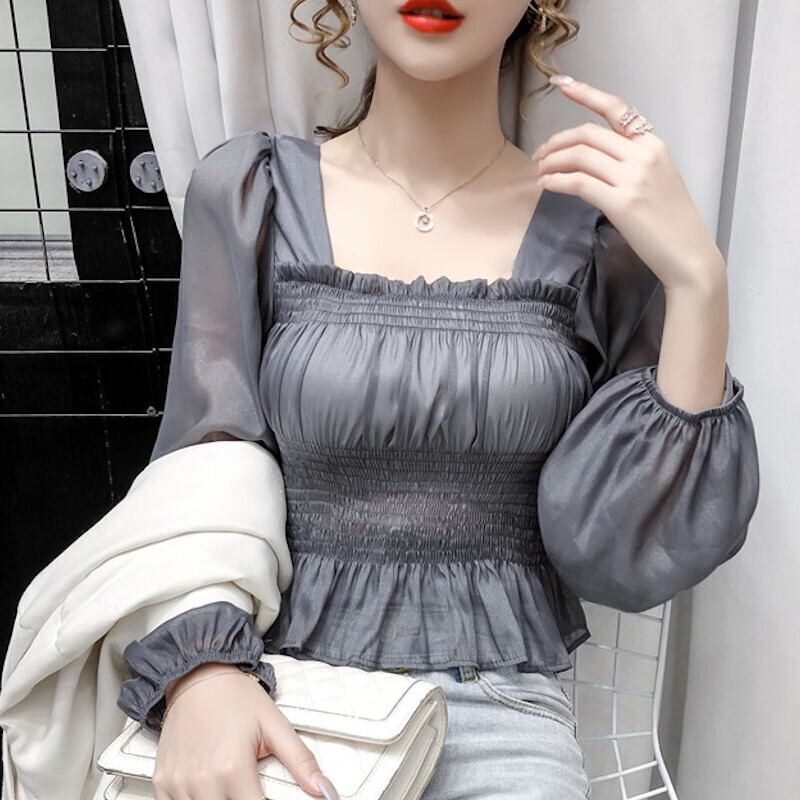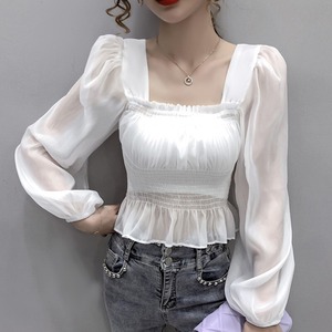 2カラー シースルー パフスリーブ シフォンブラウス S-XL *bl036