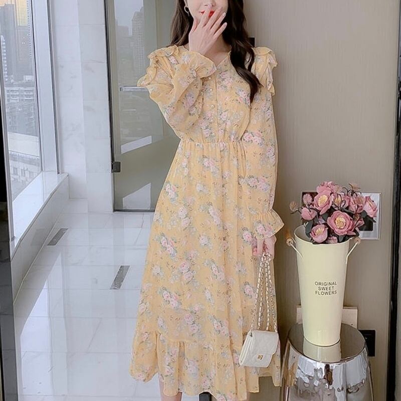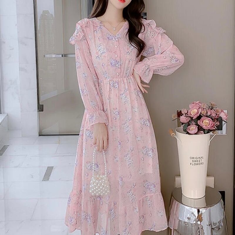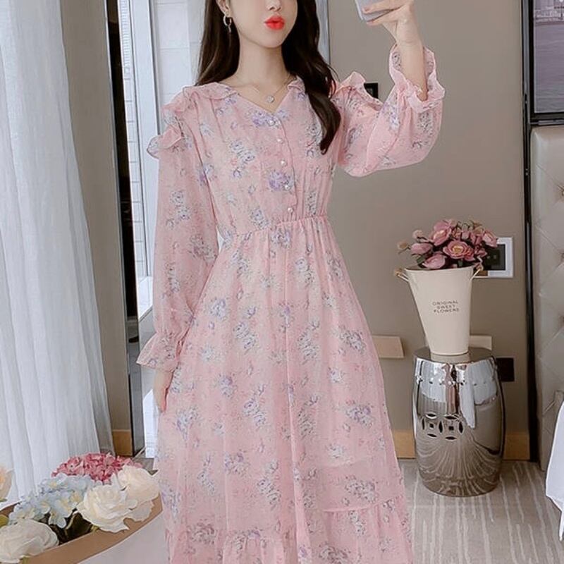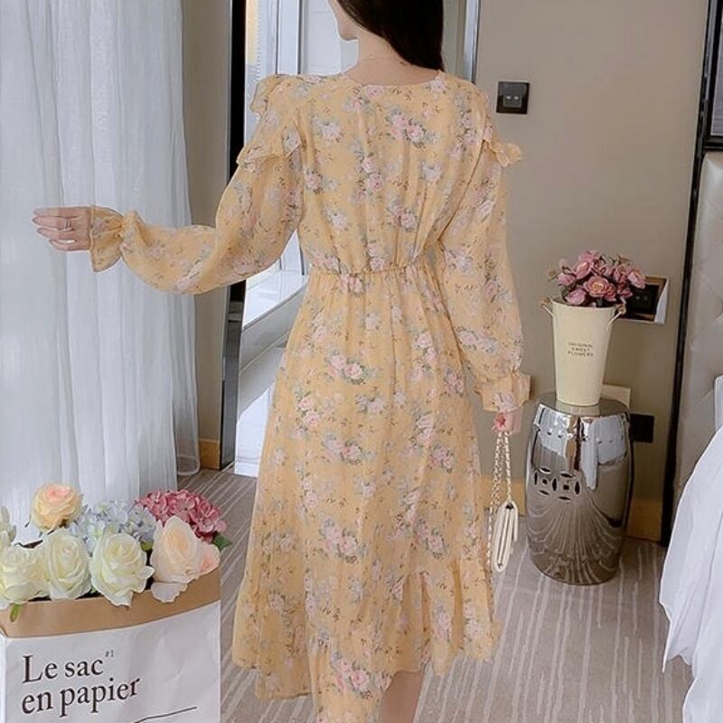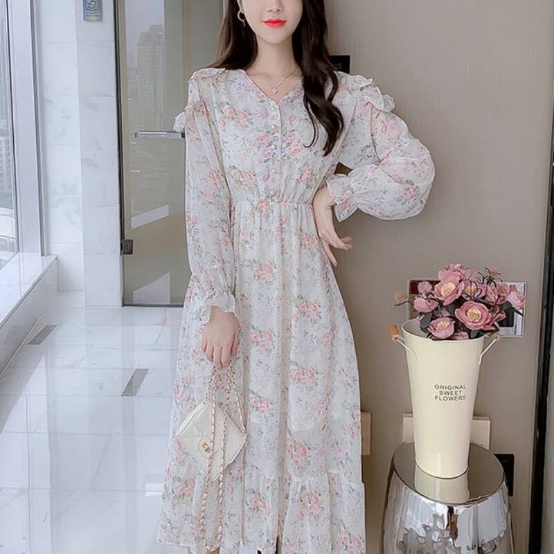 3カラー フリル フローラル シフォン ロングワンピース *on048