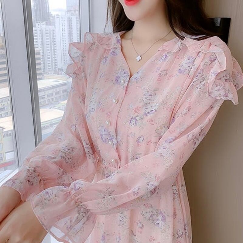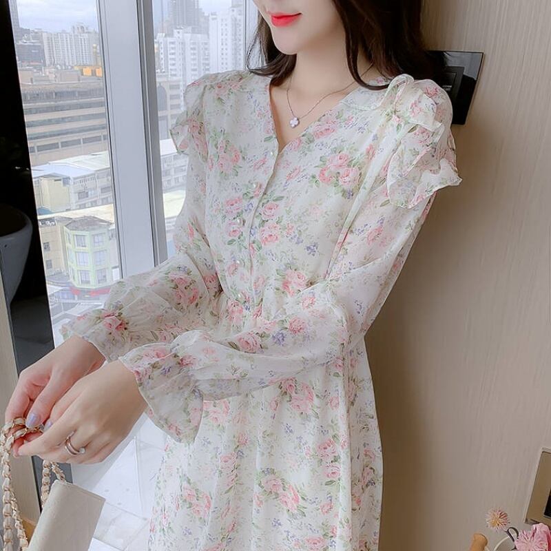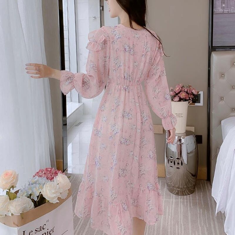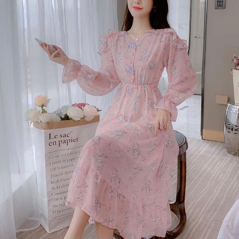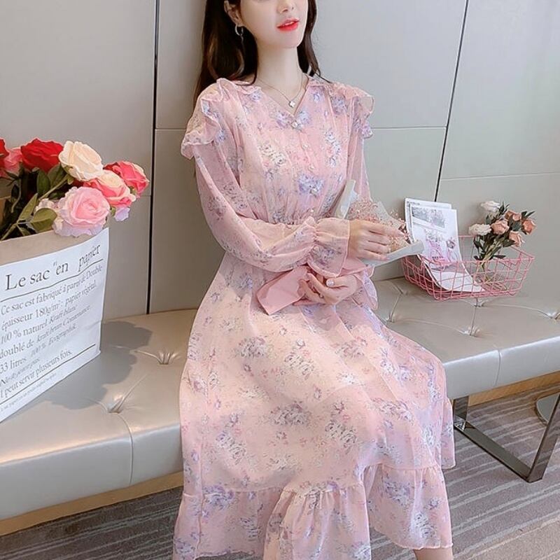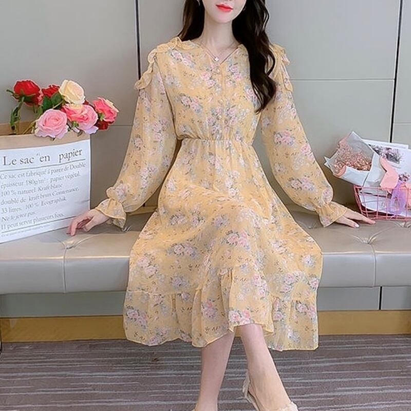 3カラー フリル フローラル シフォン ロングワンピース *on048