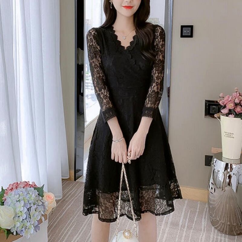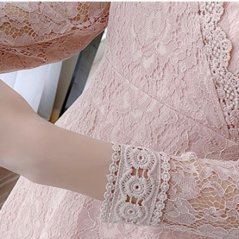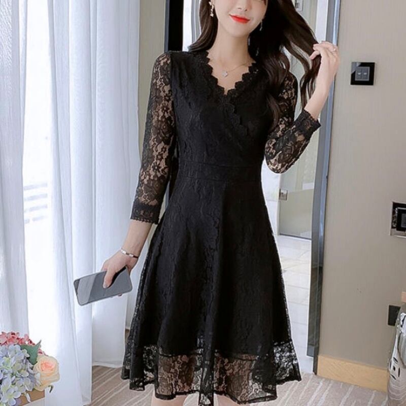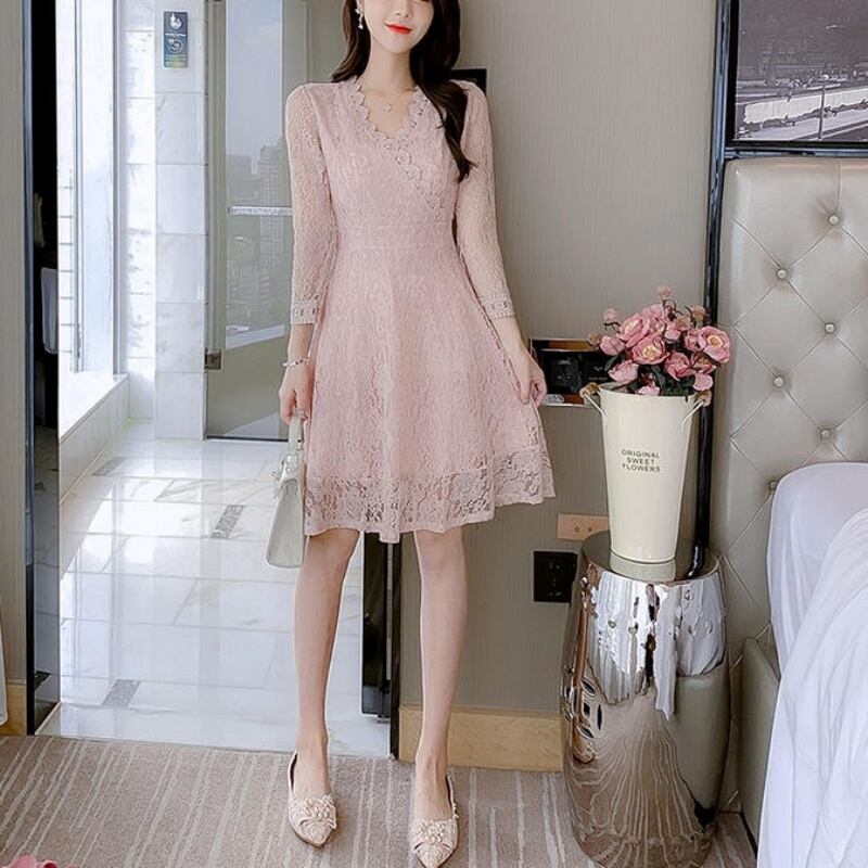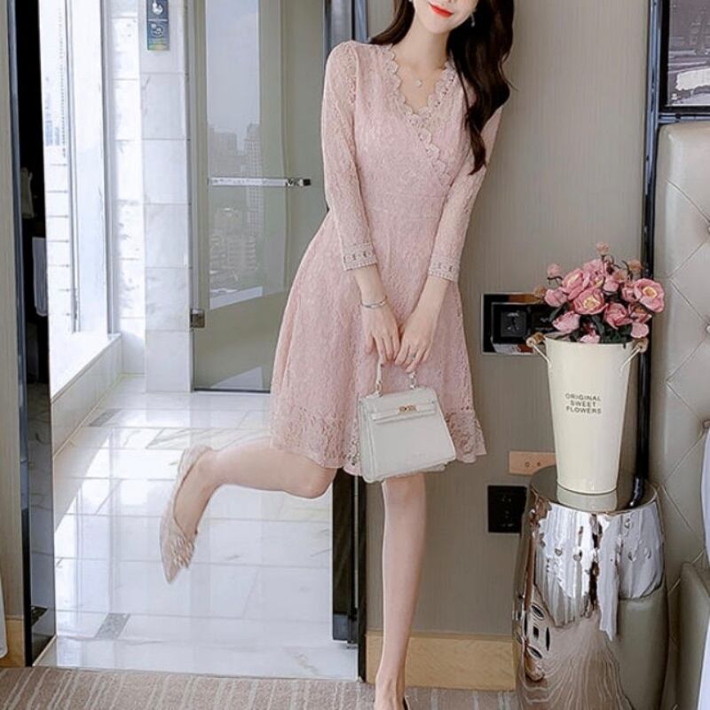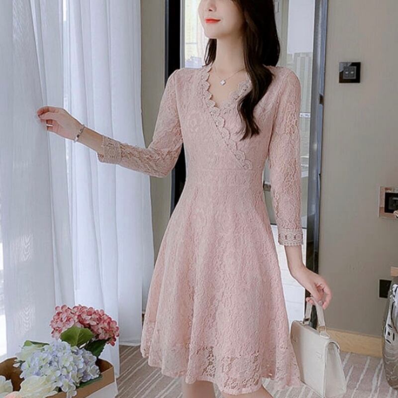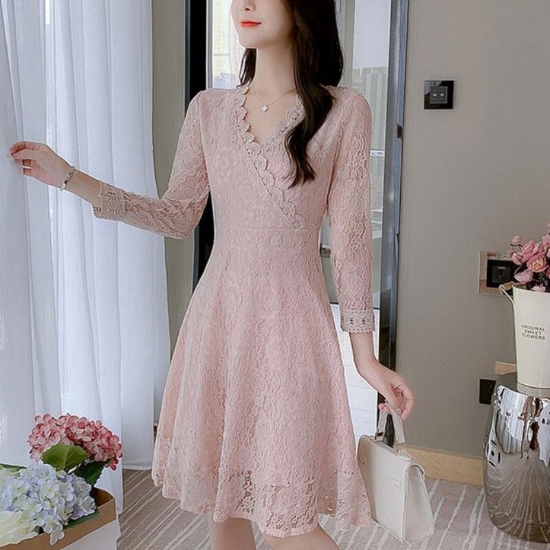 2カラー 花柄レース Vネック Aライン ワンピース *on049