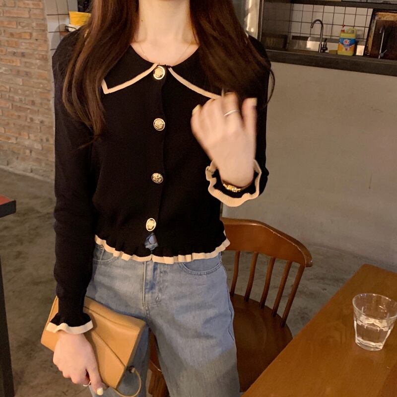 バイカラー 金ボタン フリル ニットカーディガン *ca0010