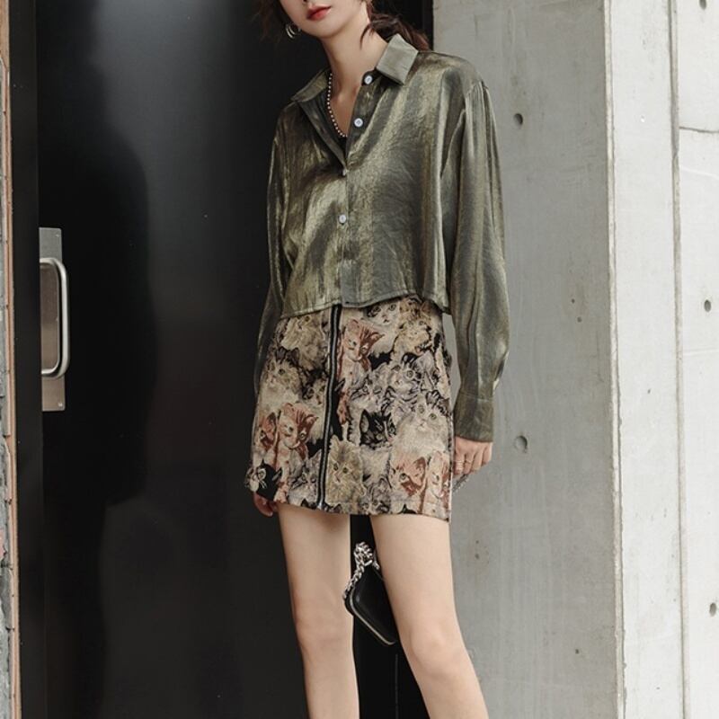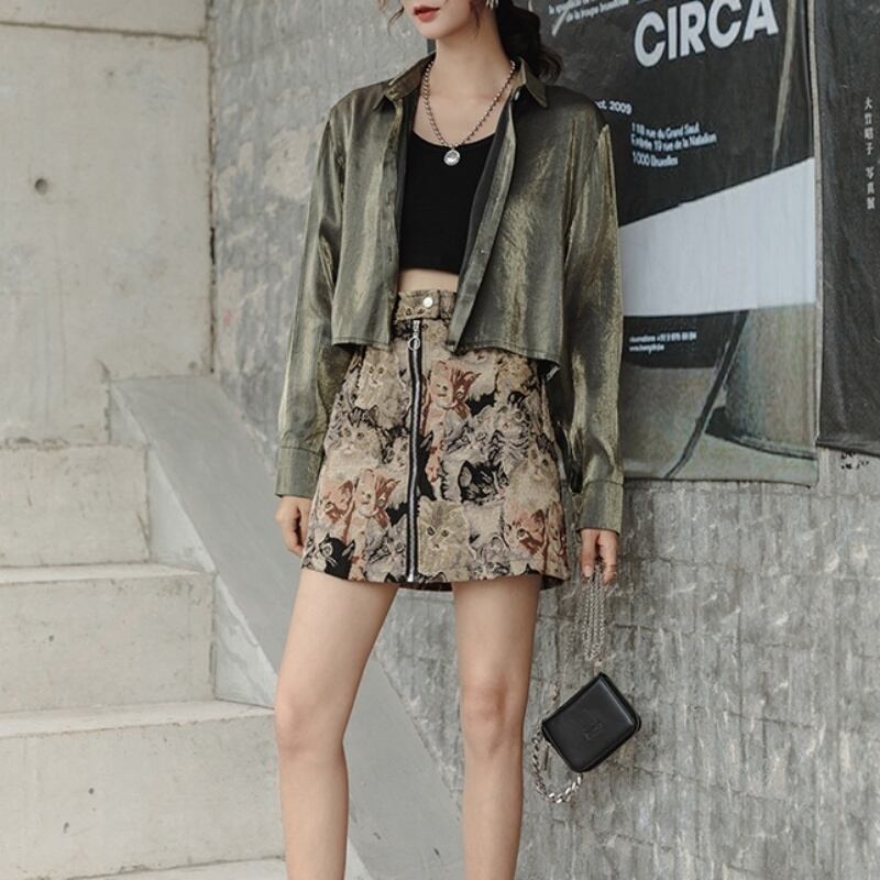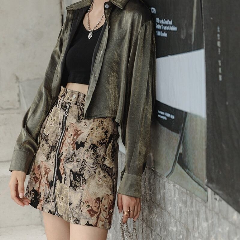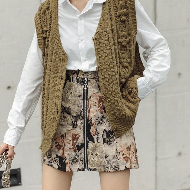 レトロプリント アニマル柄 ねこ ハイウエスト ミニスカート *sk047