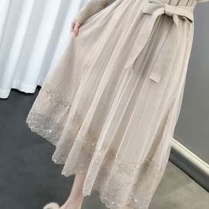 ウエストリボン×裾レースがエレガントな印象のニットワンピースです。
