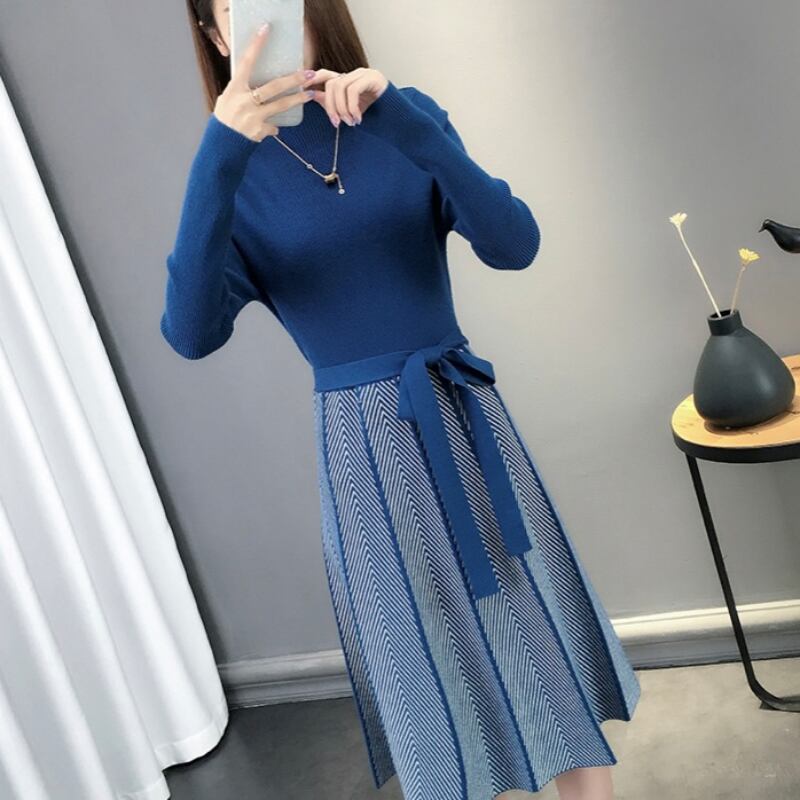 5カラー ウエストリボン プリーツスカート ニットワンピース *on051