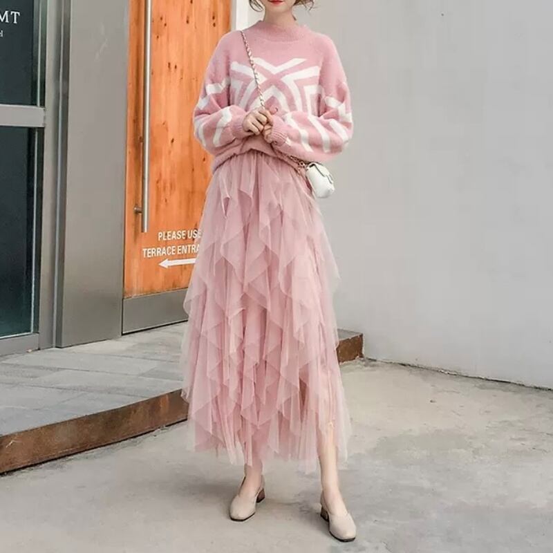 4カラー チュール メッシュ ハイウエスト ロングスカート *sk049