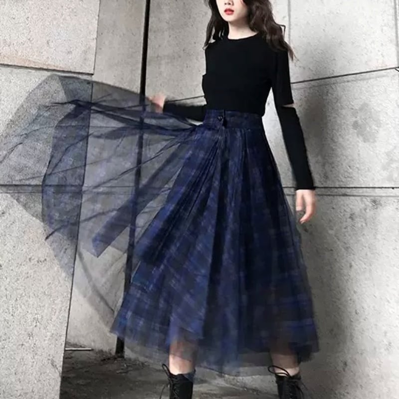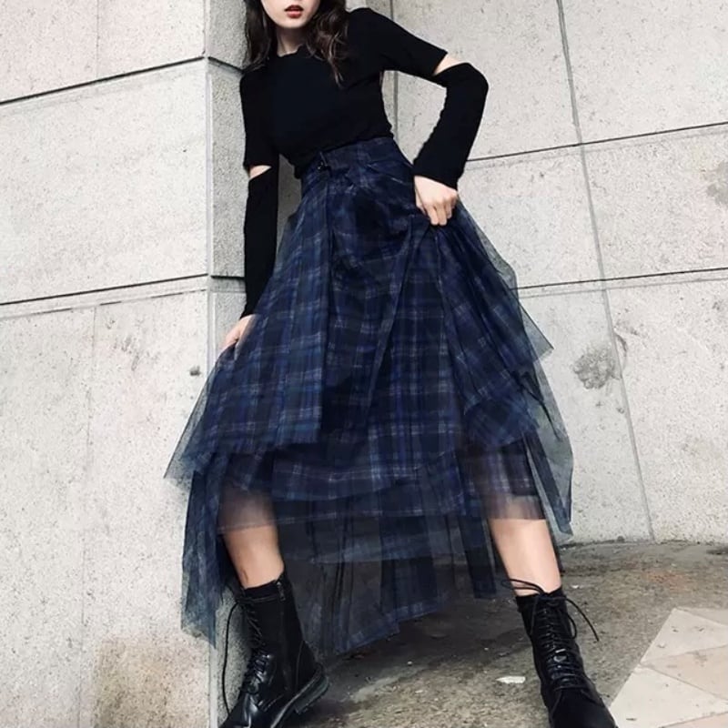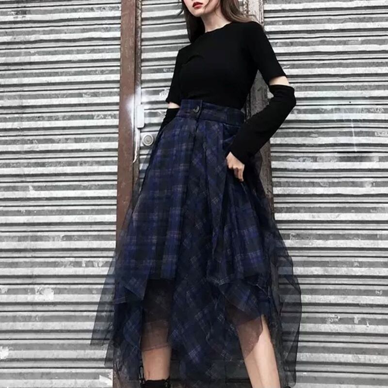 チェック柄 レトロ ランダム裾 ハイウエスト ロングスカート *sk051
