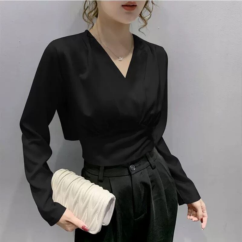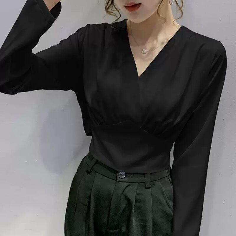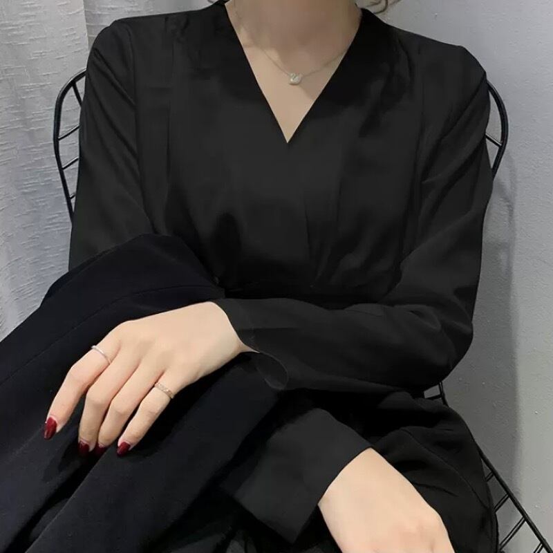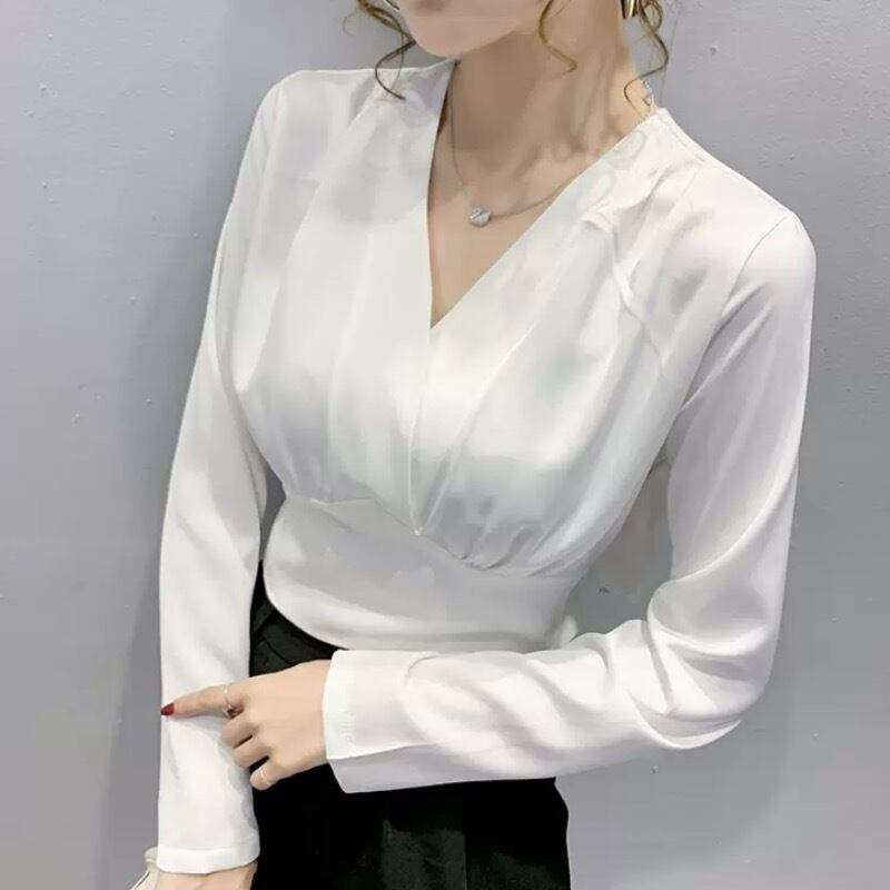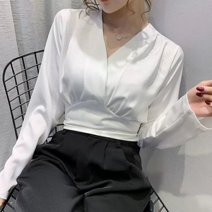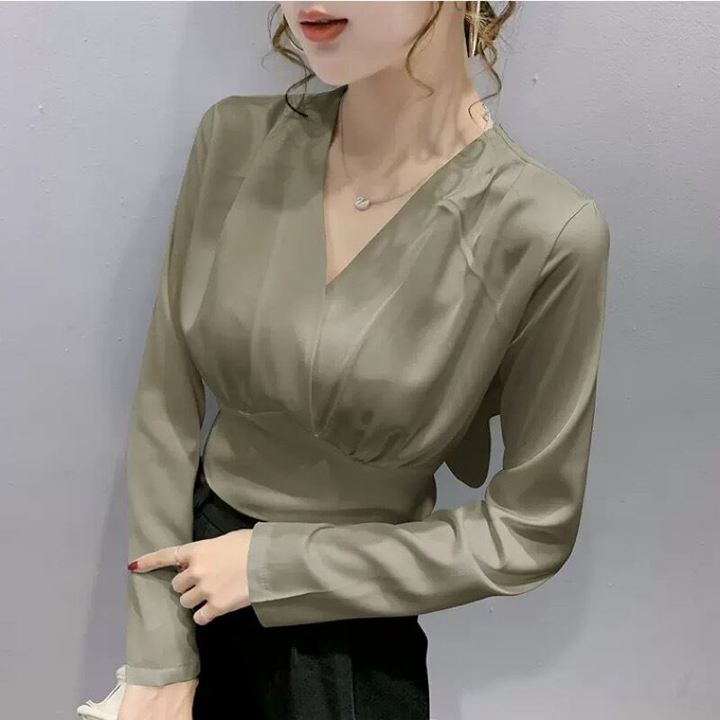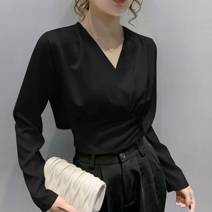 3カラー Vネック タイト オフィス 無地 長袖 ブラウス *bl073
