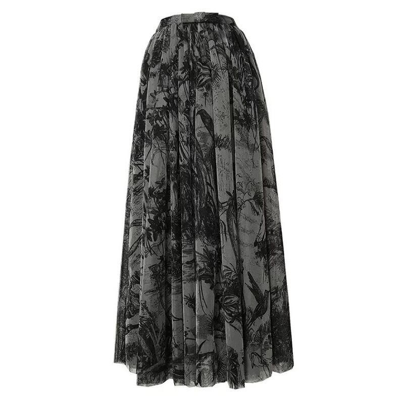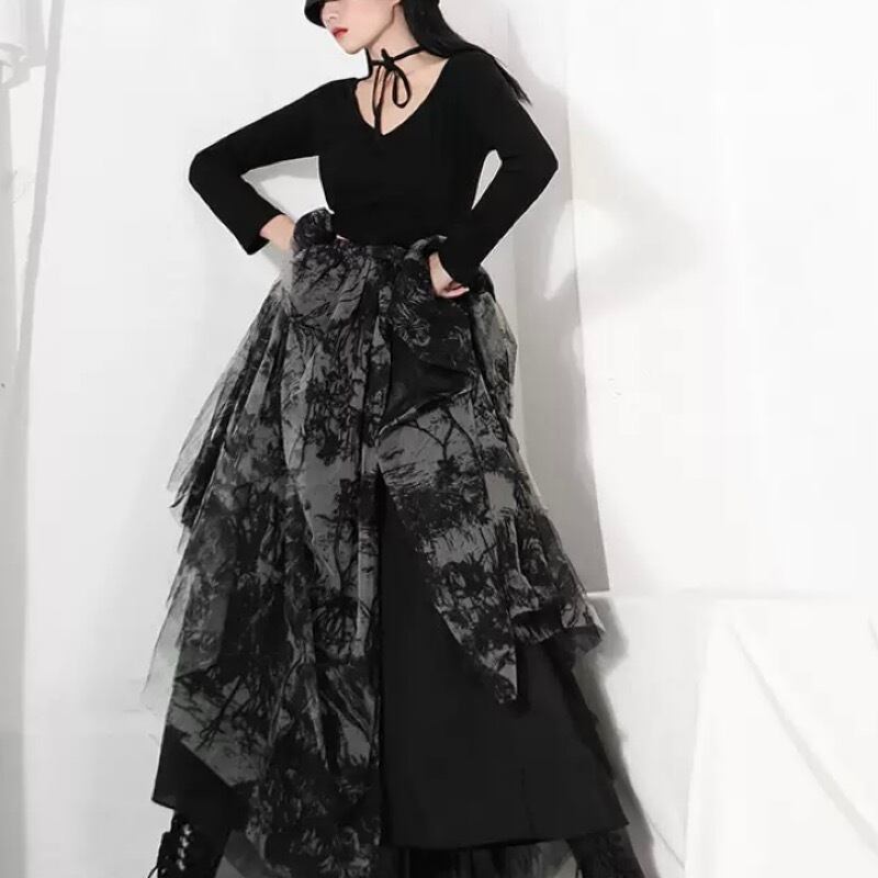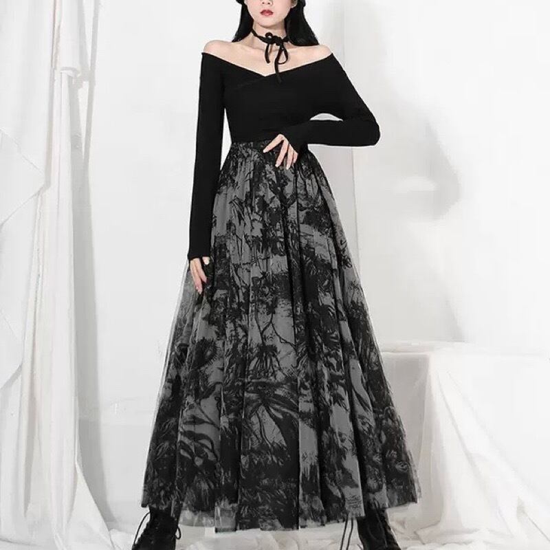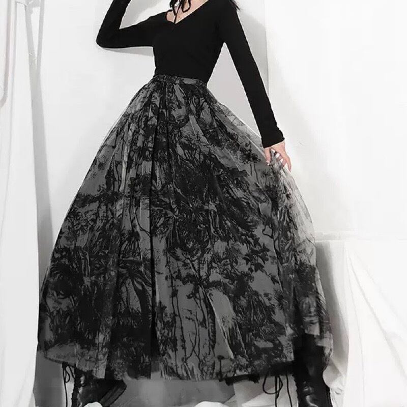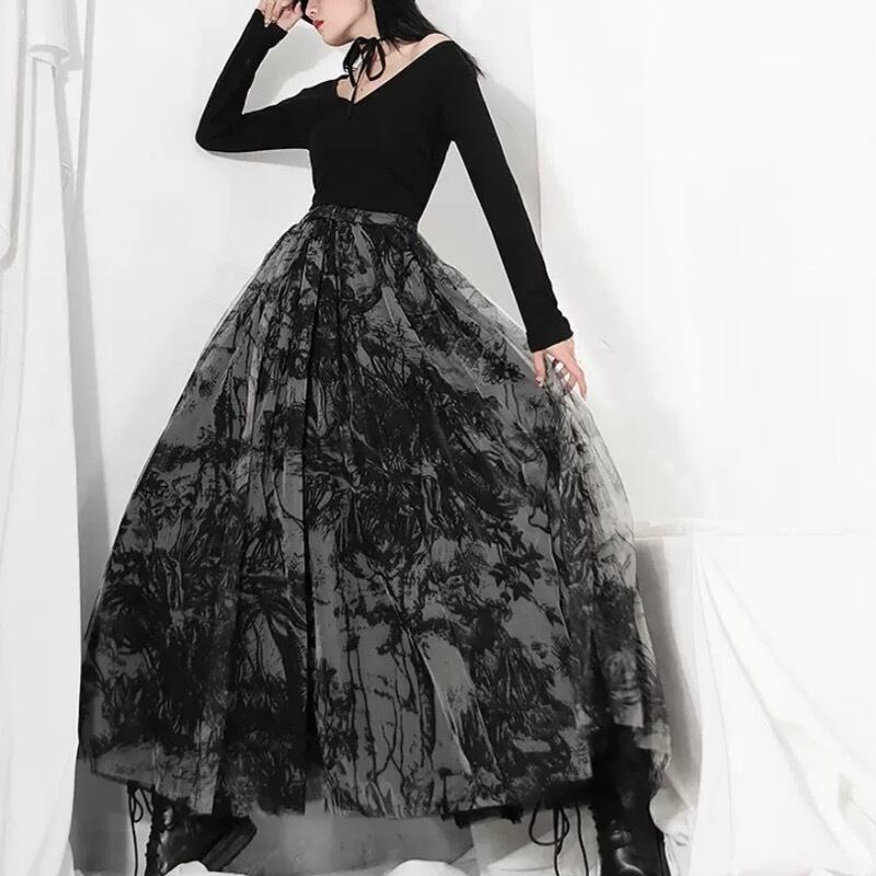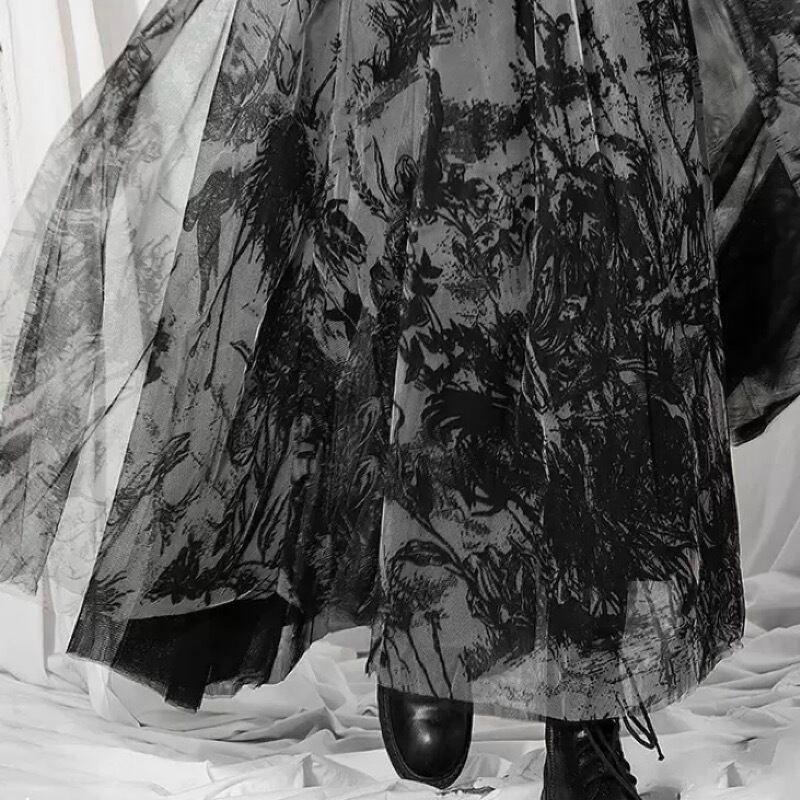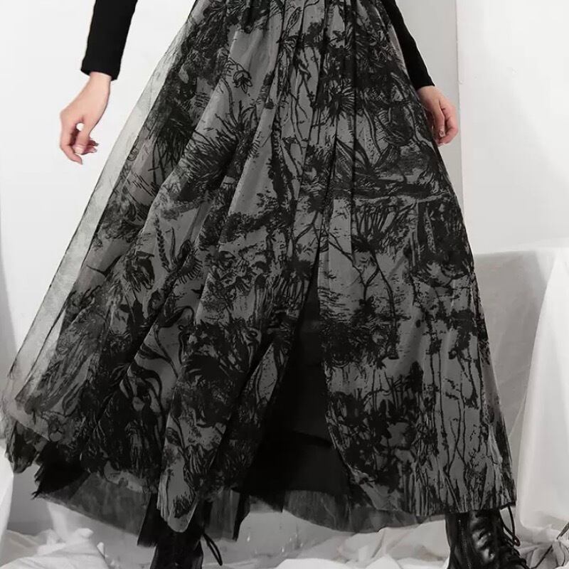 レトロ ダークプリント メッシュ ハイウエスト ロングスカート *sk053