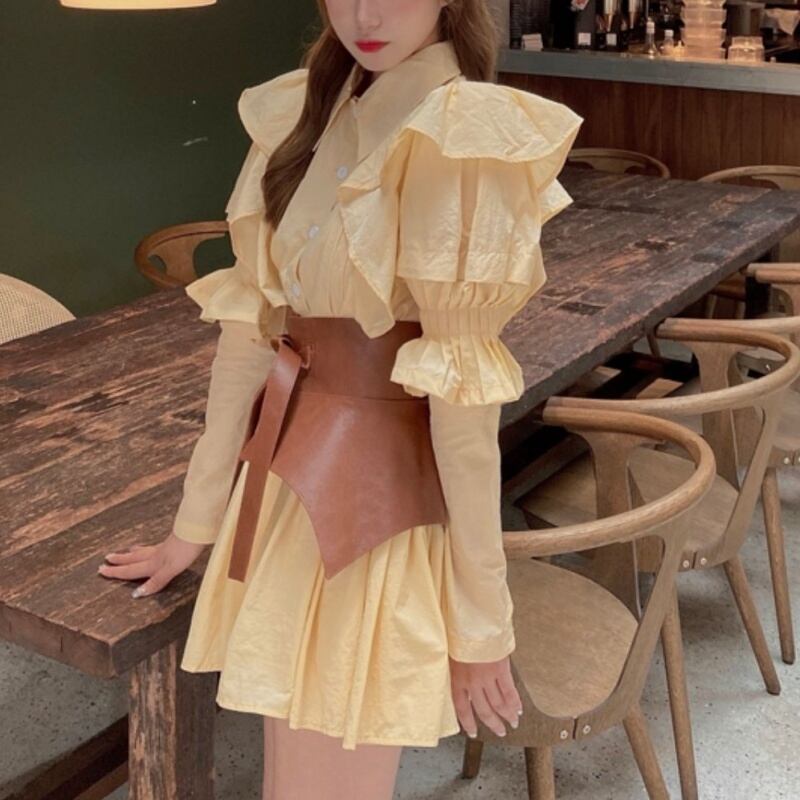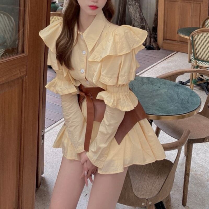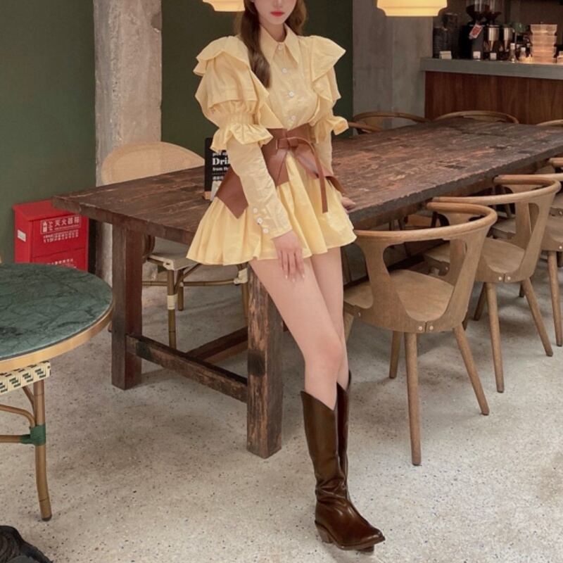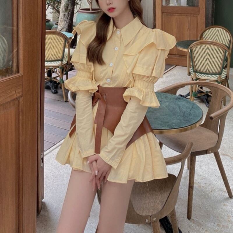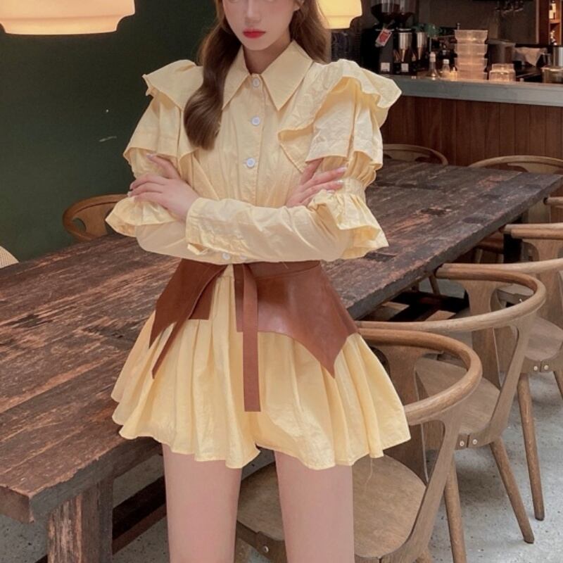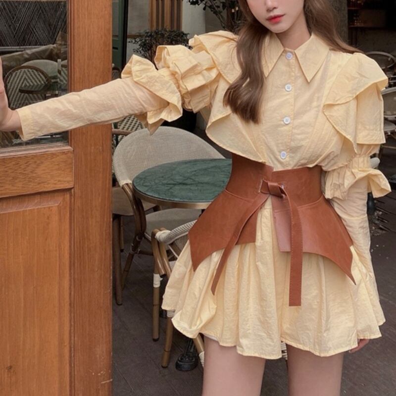 大判のフリルが可愛いミニ丈シャツワンピース×コルセットのセットアップです。