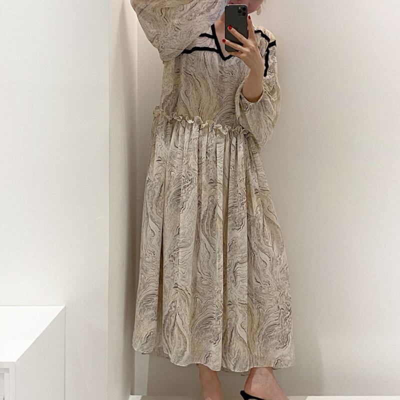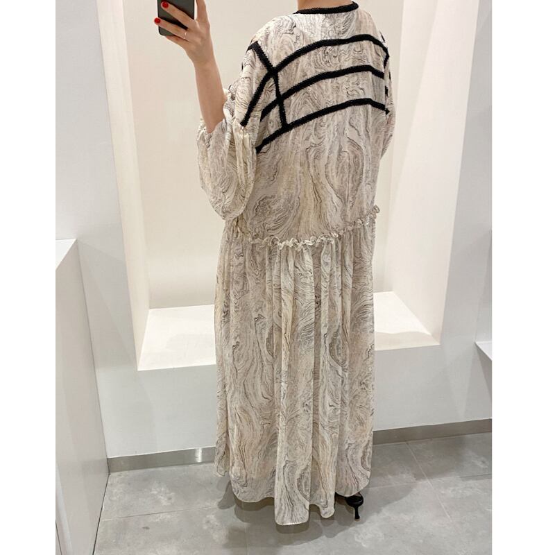 ベージュのマーブル模様が上品な雰囲気を醸し出すエレガントなワンピースです。
