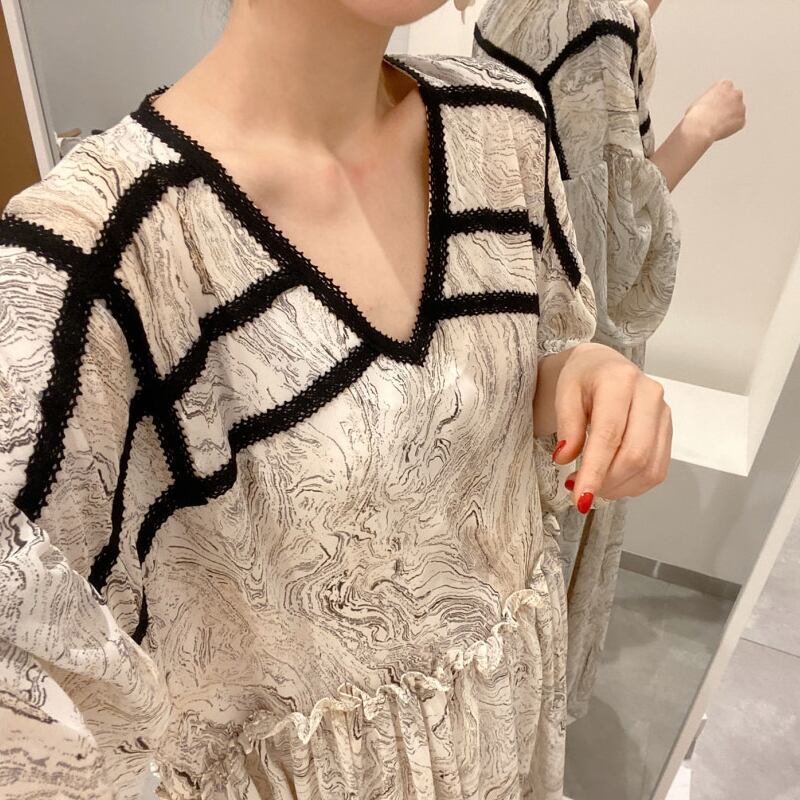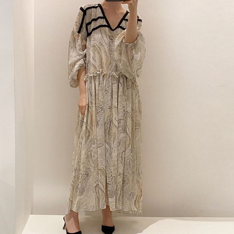 Vネック ランタンスリーブ ロング丈 マーブル ワンピース *on070