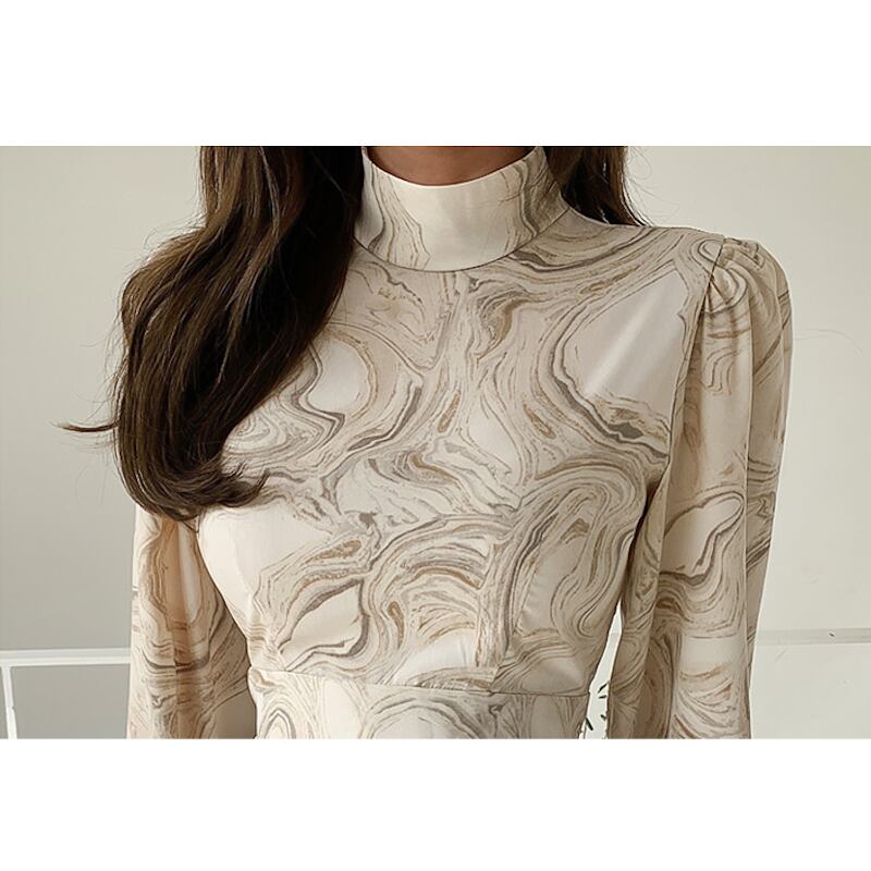 シック エレガント マーブル柄 ベルスリーブ ハイネック ミニ丈 タイト ワンピース *on079