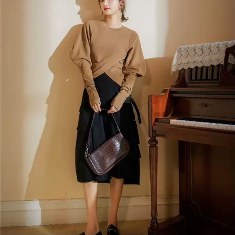 シンプル 無地 パフスリーブ V字裾 長袖 カットソー Tシャツ *bl096
