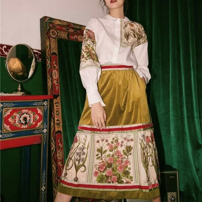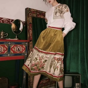 レトロ花柄 ベルベット ハイウエスト ミディ丈 フレアスカート セットアップ可 *se001