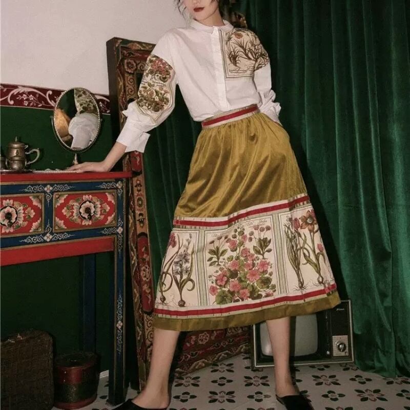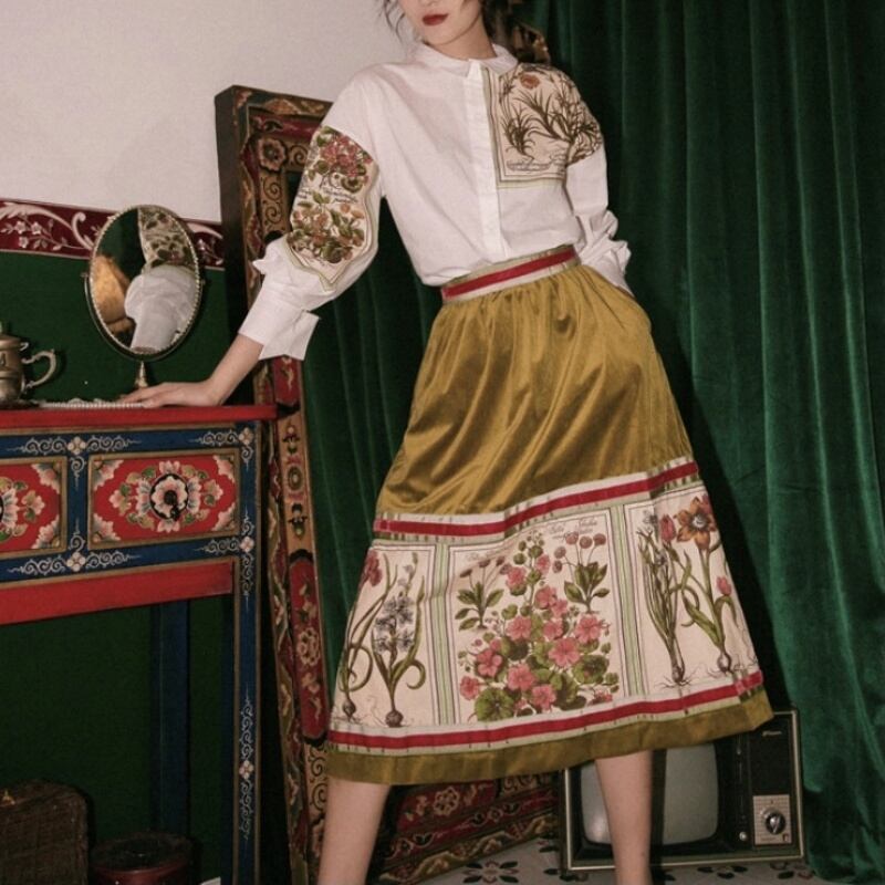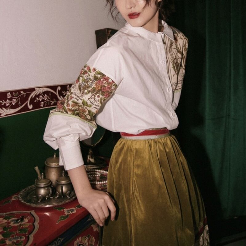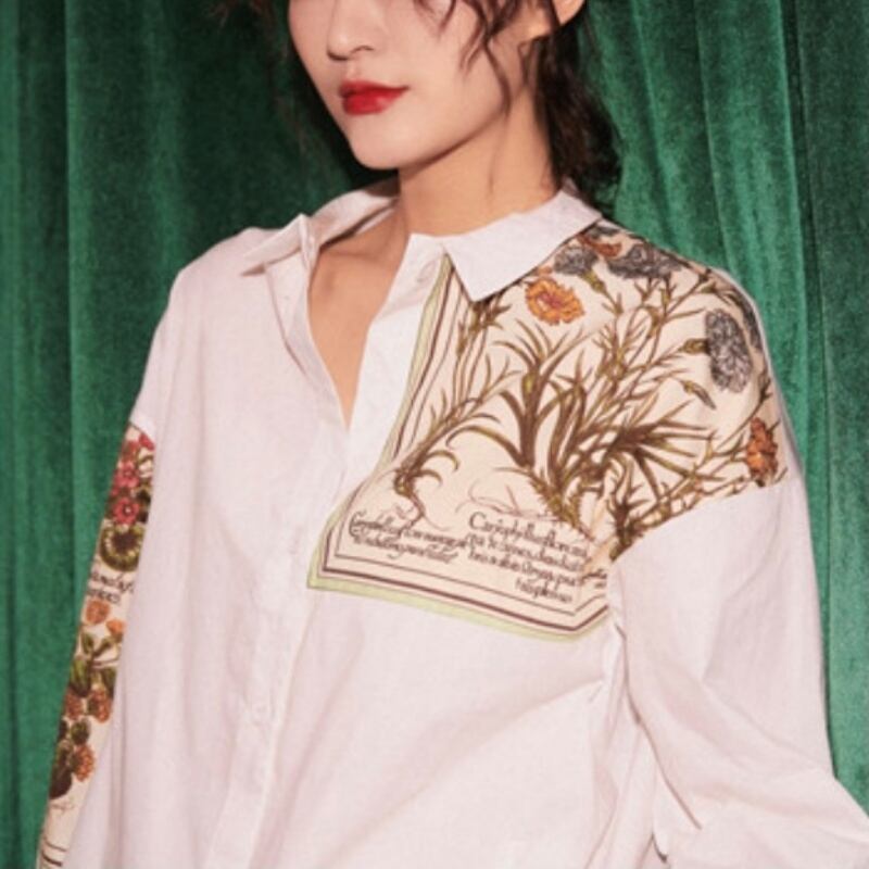 レトロ花柄 パフスリーブ 長袖 ゆったり ブラウス シャツ セットアップ可 *se002