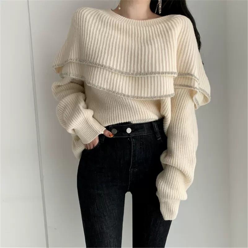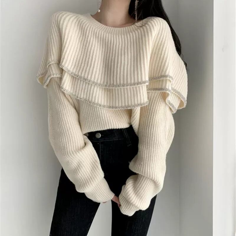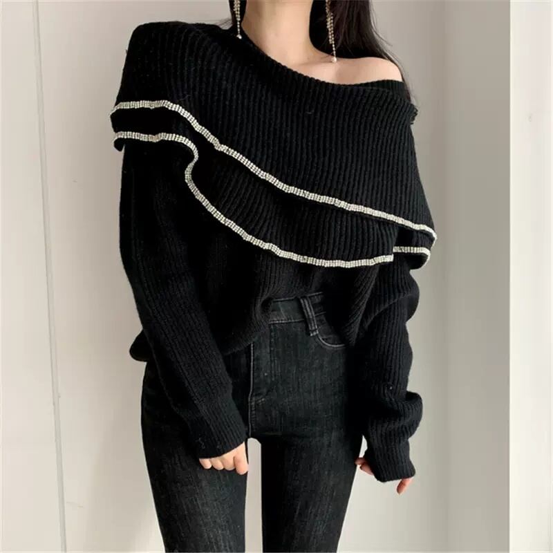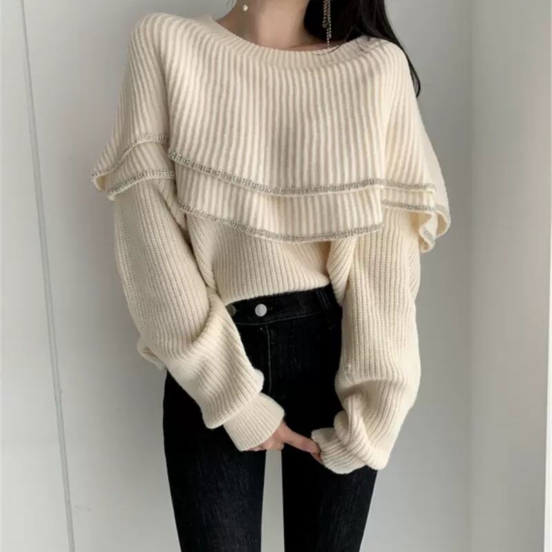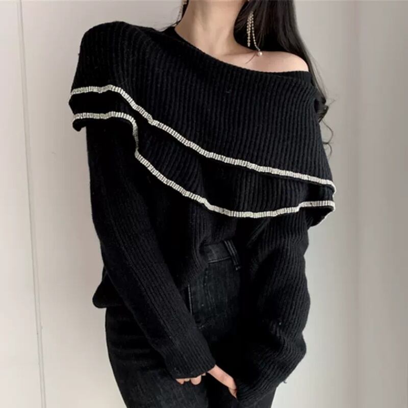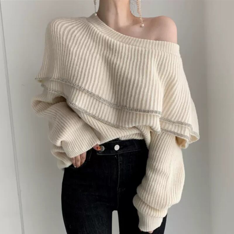 2カラー フリル ワンショルダー プルオーバー ゆったり ニット セーター *ks050