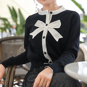 モノトーン リボン スリム ラウンドネック フェミニン カーディガン *ca038