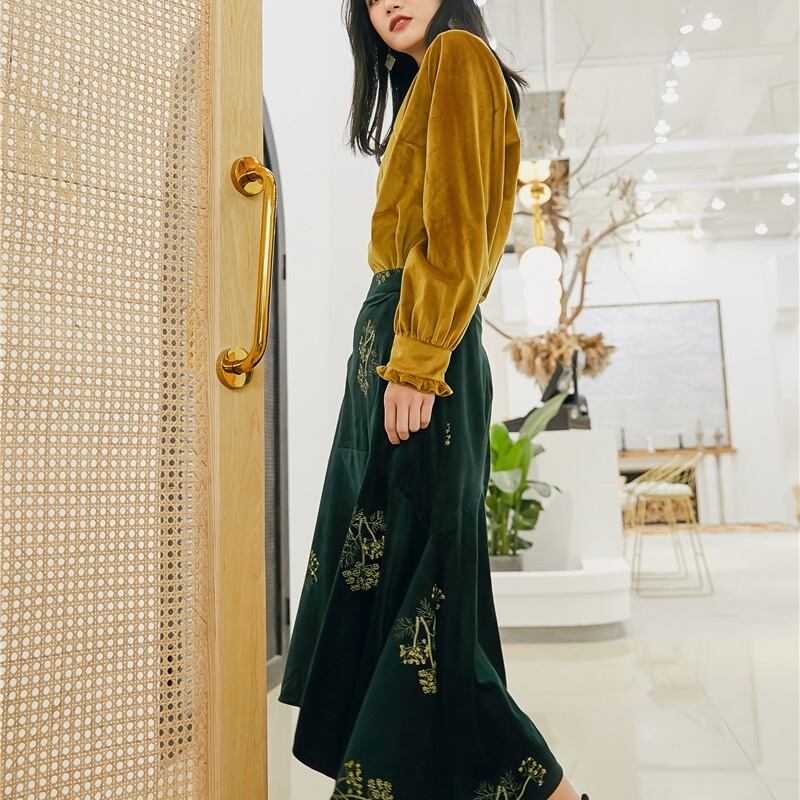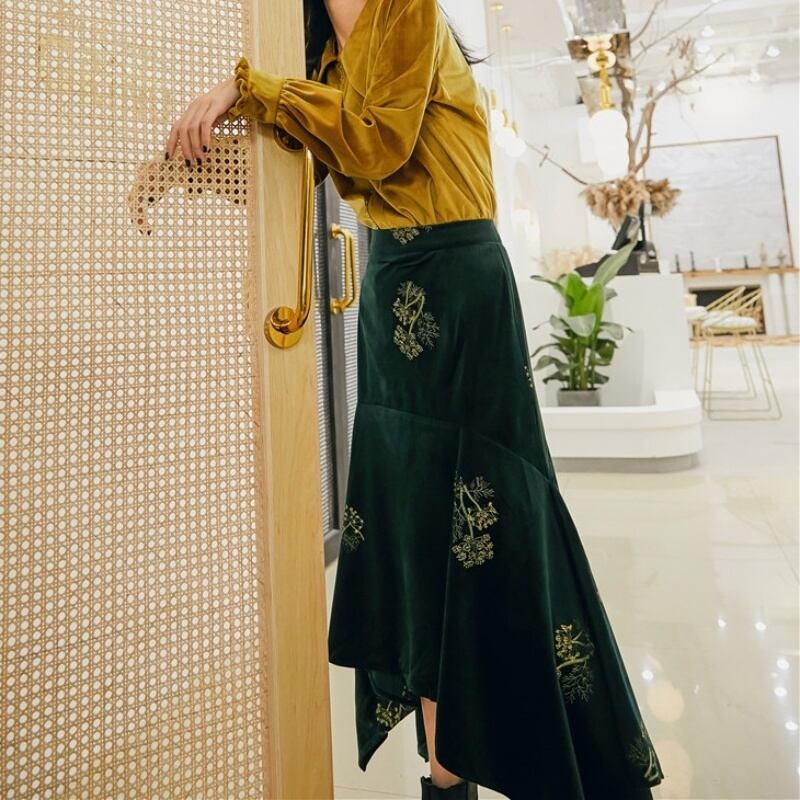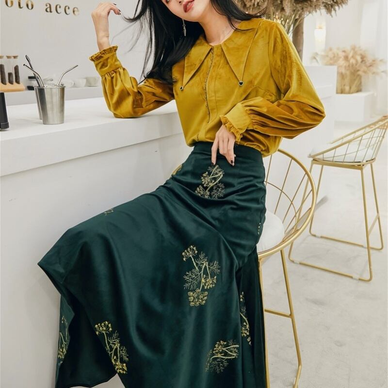 レトロクラシカル 裾広がり ベルベット 刺繍 ロングスカート セットアップ可 *se005