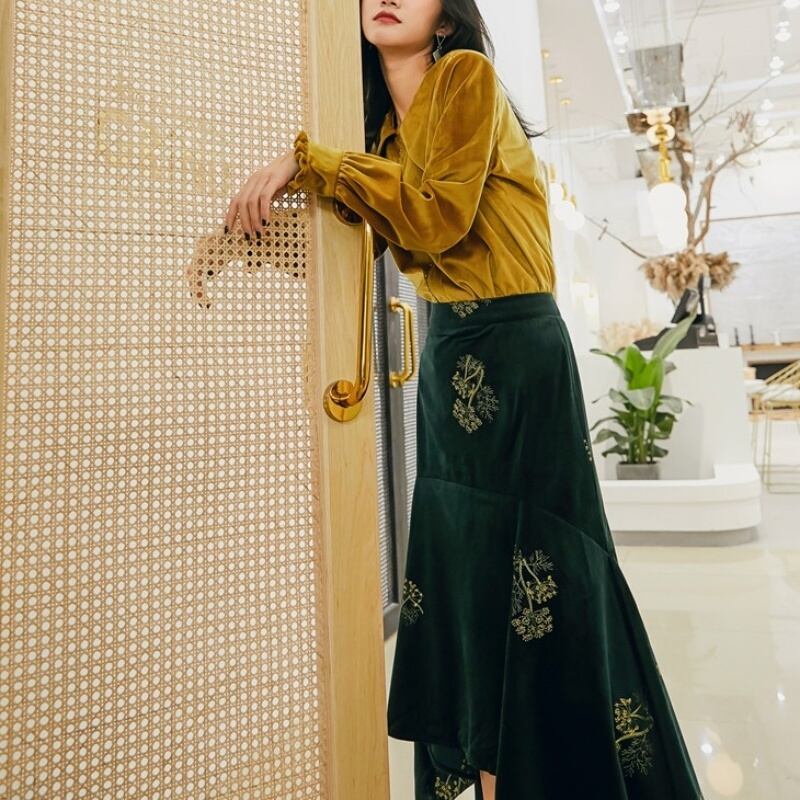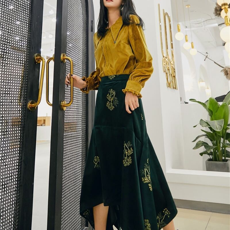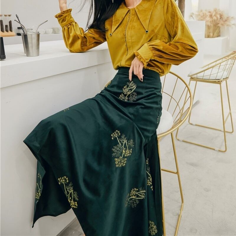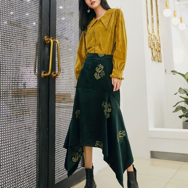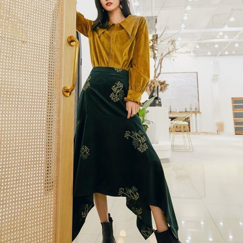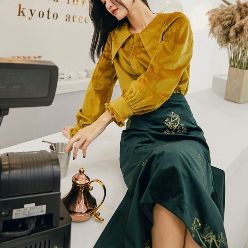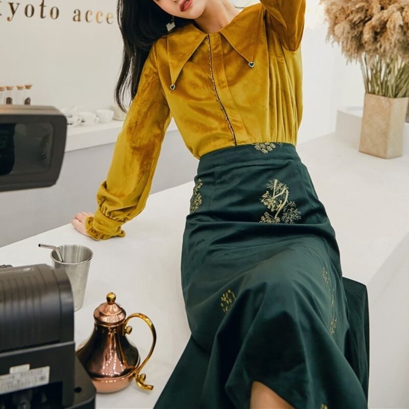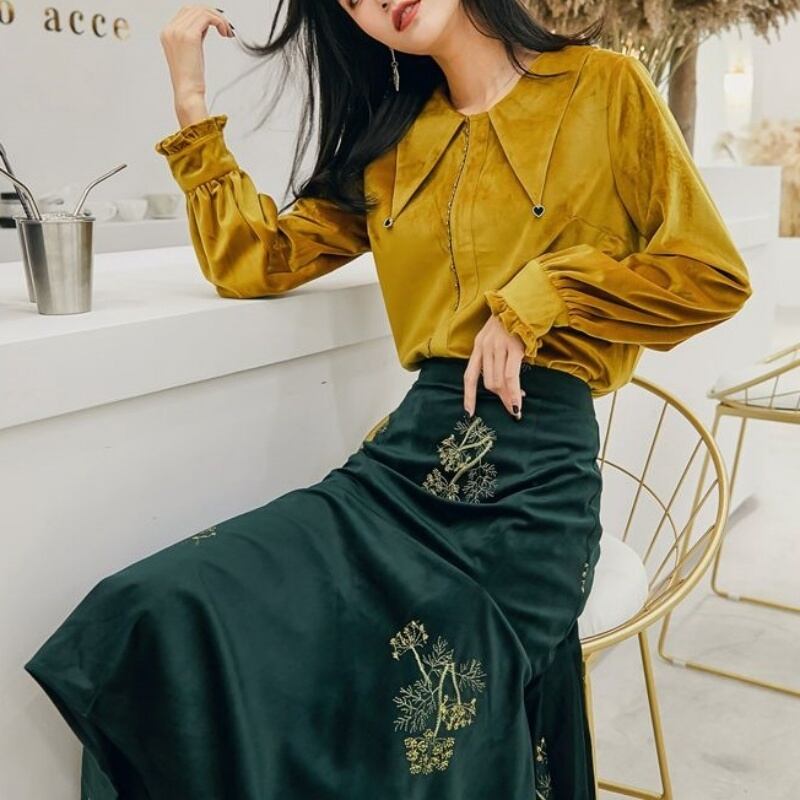 レトロ ベルベット ポインテッドカラー 長袖 シャツ セットアップ可 *se006