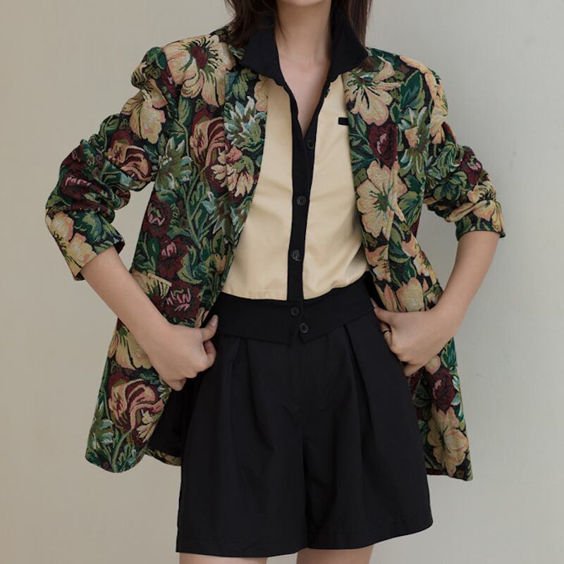 お花を散りばめた華やかなフローラル生地が可愛いレトロなジャケットです。