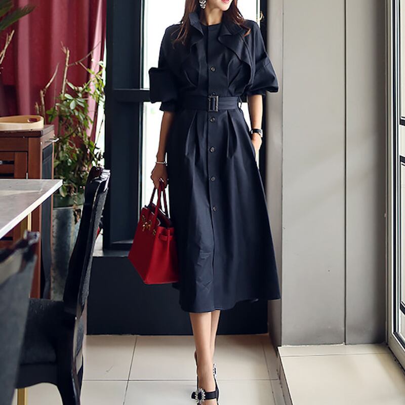 レトロ バフスリーブ ウエストリボンベルト ミディ丈 ワンピース *on080