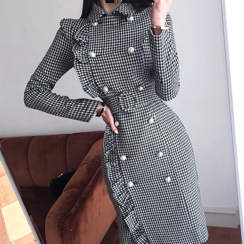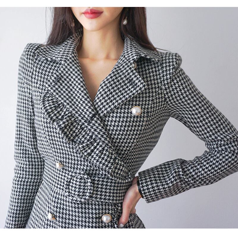 落ち着いたカラーのレトロな千鳥格子の柄が大人レディで品のあるスタイリングにする存在感たっぷりでお洒落な一着です。