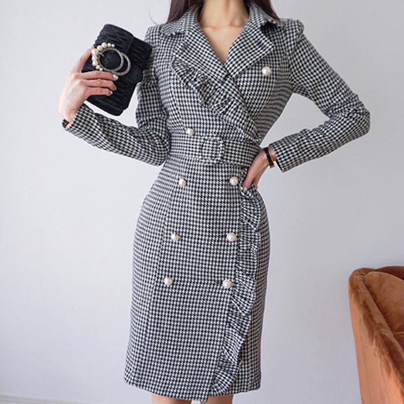 レトロ 千鳥格子 長袖 Vネック フリル パール ウエストベルト ミディ丈 ワンピース ドレス *on081