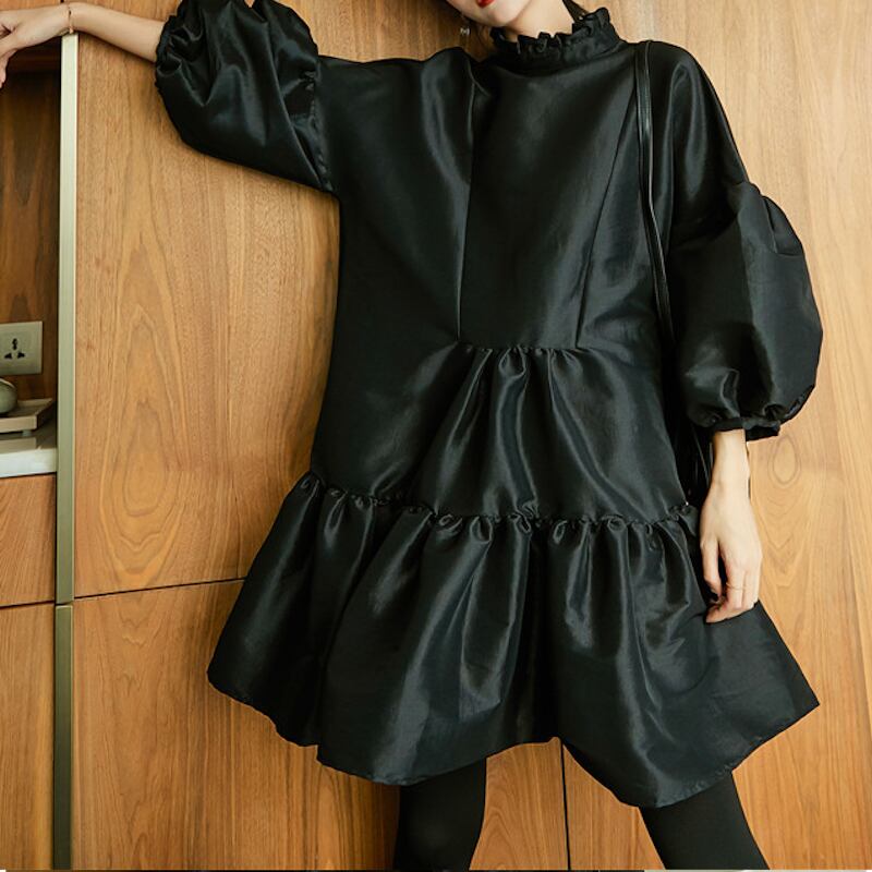クラシカル 無地 パフスリーブ 長袖 ティアード ミニ丈 ワンピース *on093
