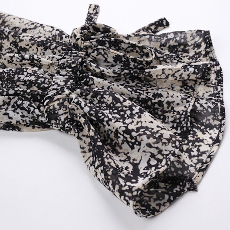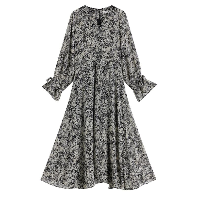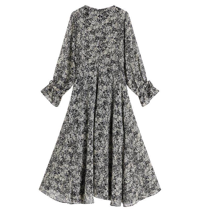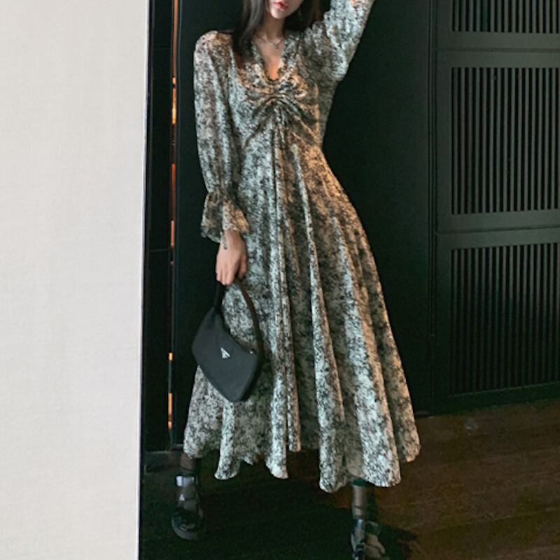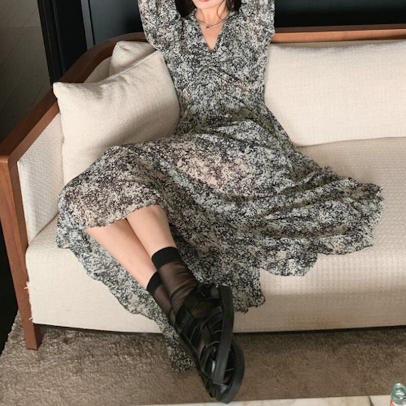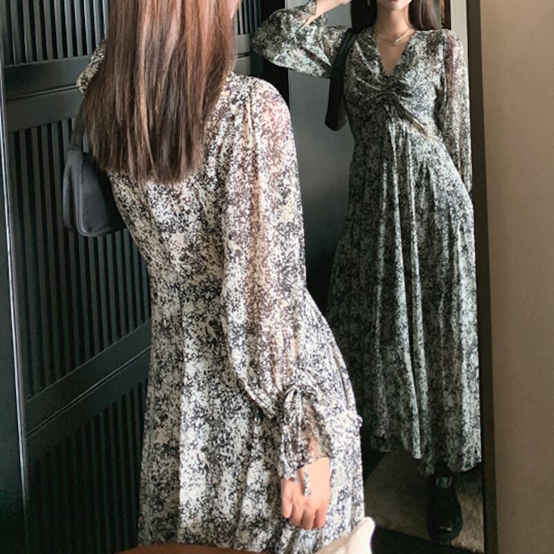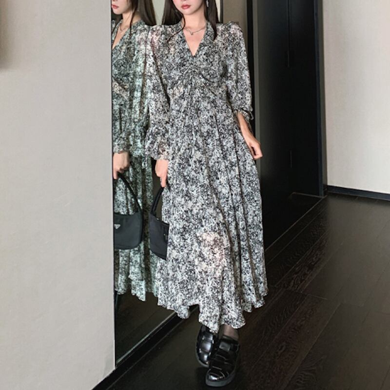 シフォン フローラル Vネック 長袖 Aライン ドレス ワンピース *on090