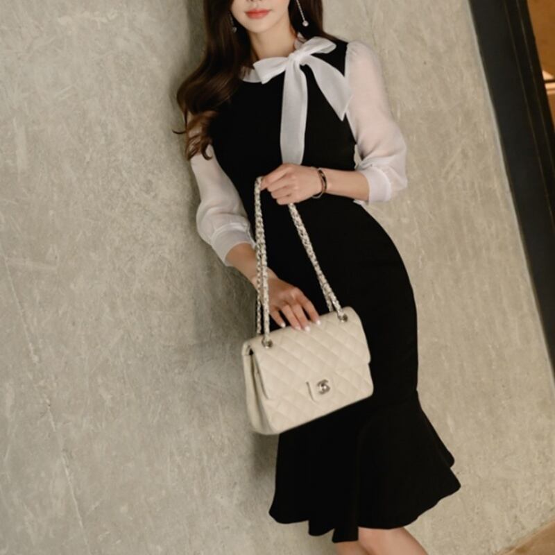 ネックリボン シアー 上品 裾フリル タイト おしゃれ ミディワンピース *on094
