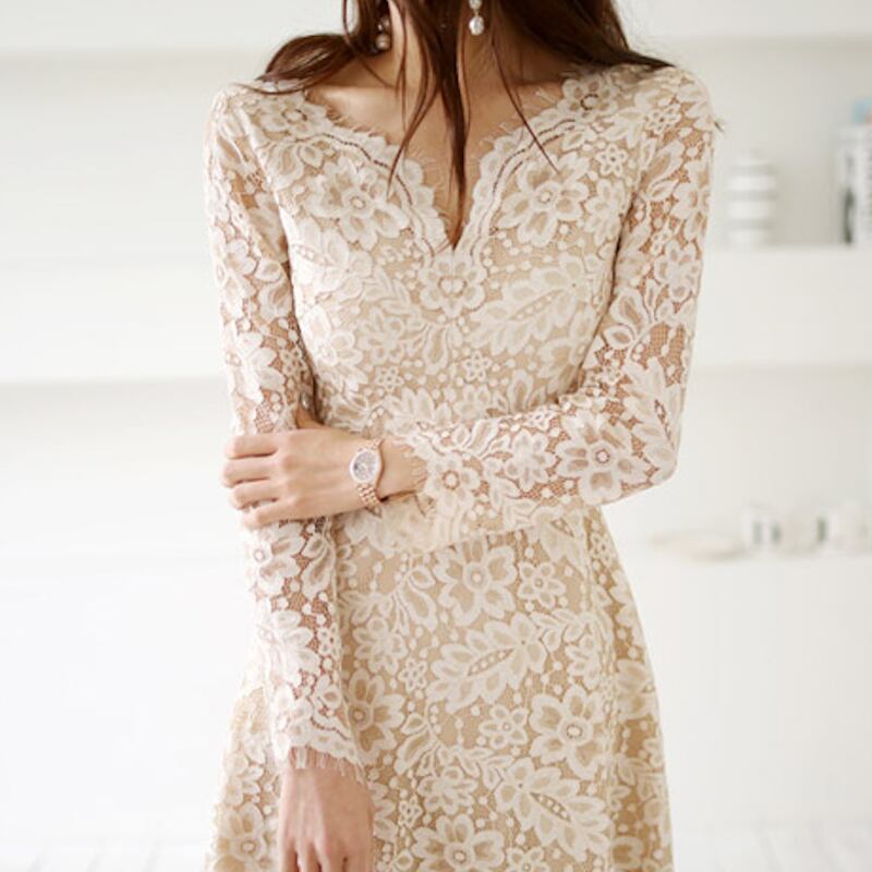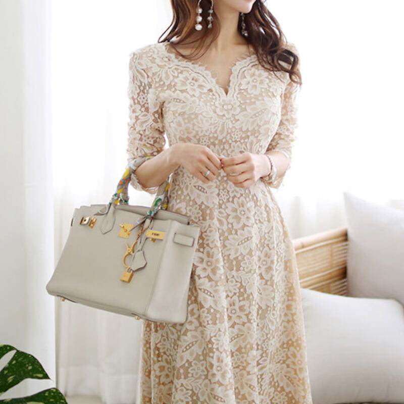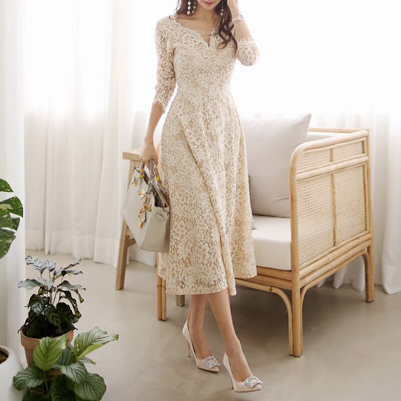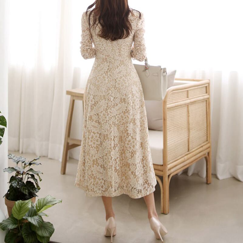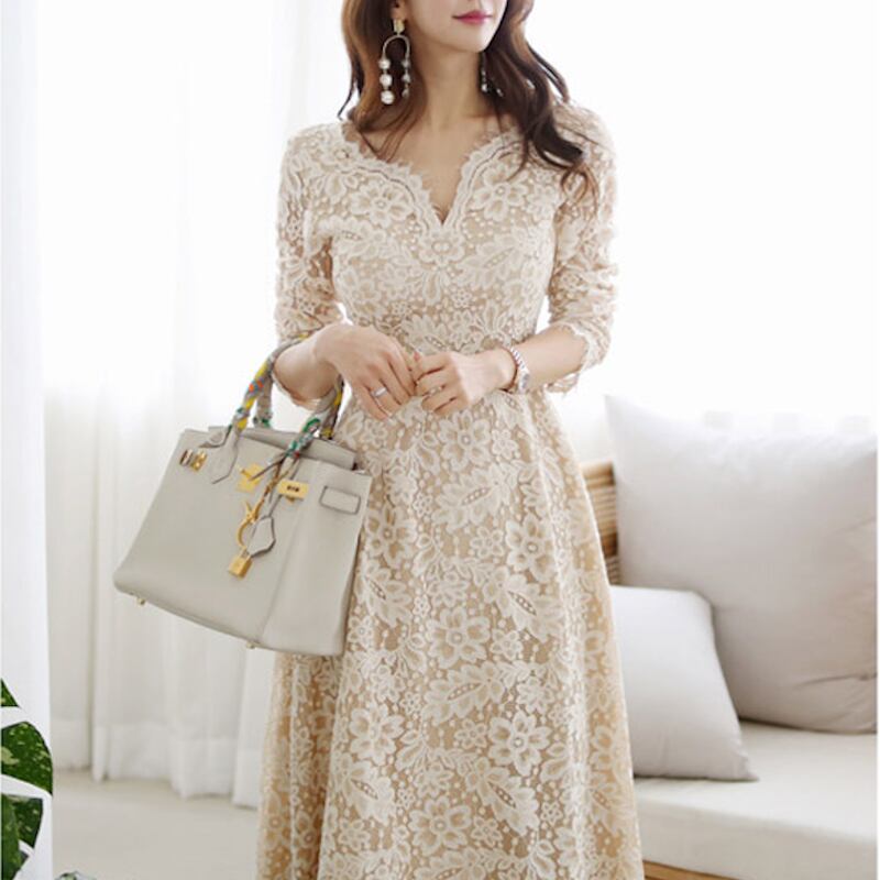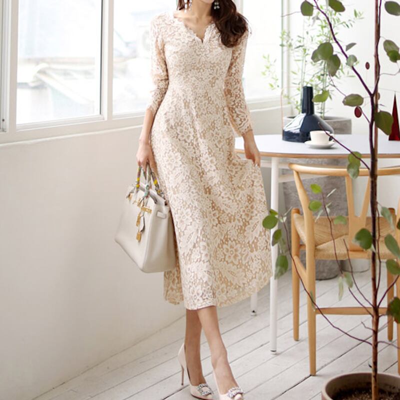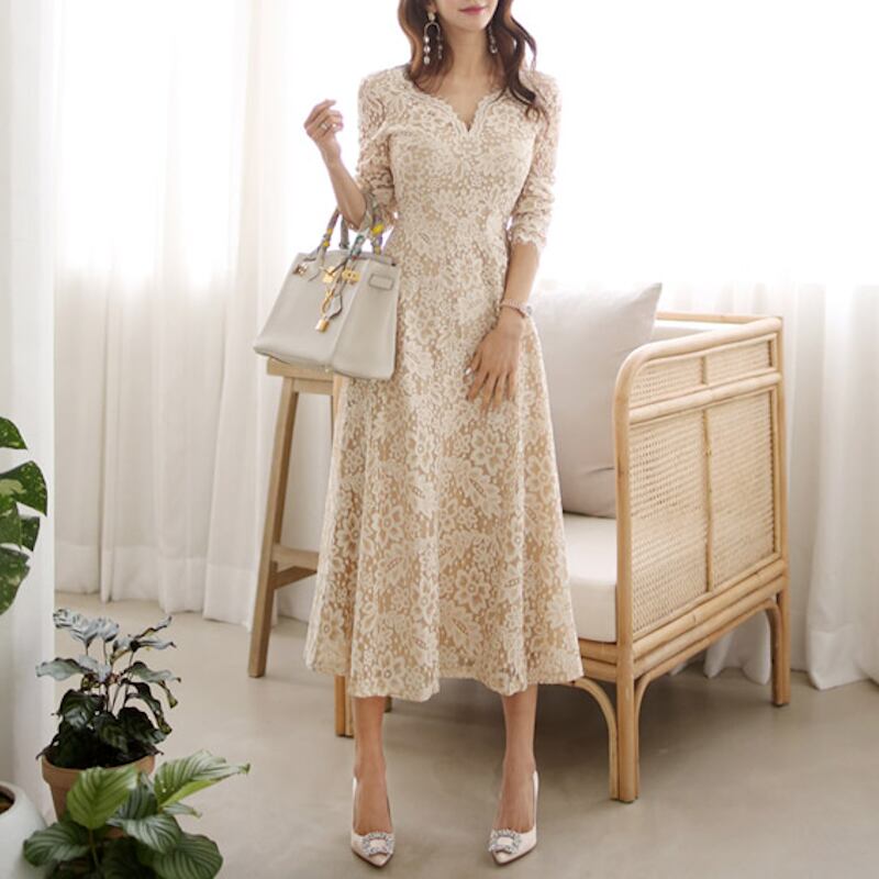 花柄 Vネック かぎ針編み レース 長袖 Aライン ロング丈 ドレス ワンピース S-XL *on096