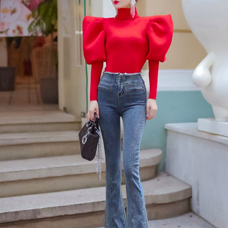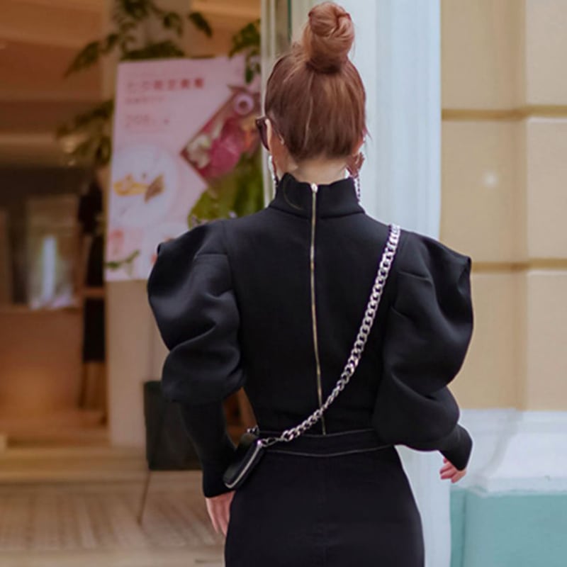 2カラー ハイネック ボリューム パフスリーブ 長袖 無地 ミディ丈 ボトミングシャツ トップス *bl103