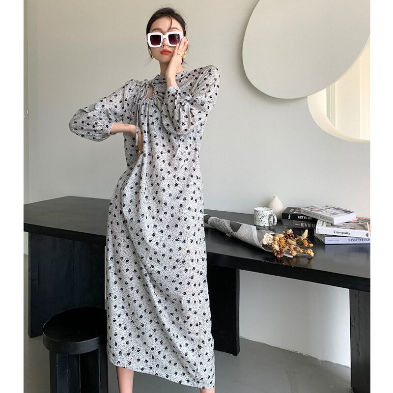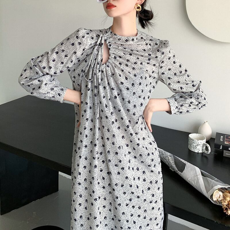 2タイプのドット柄が交わったお洒落なディテール、上品でふわっと軽やかに揺れる大人可愛いワンピースです。