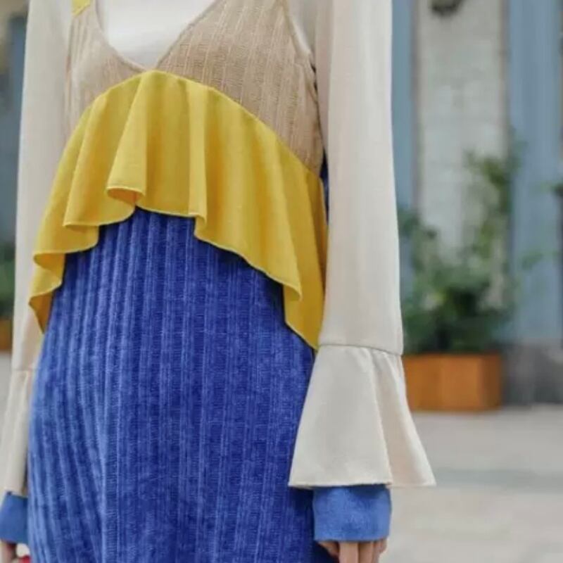 カラーブロッキング配色&フリルが目を引くセットアップです。