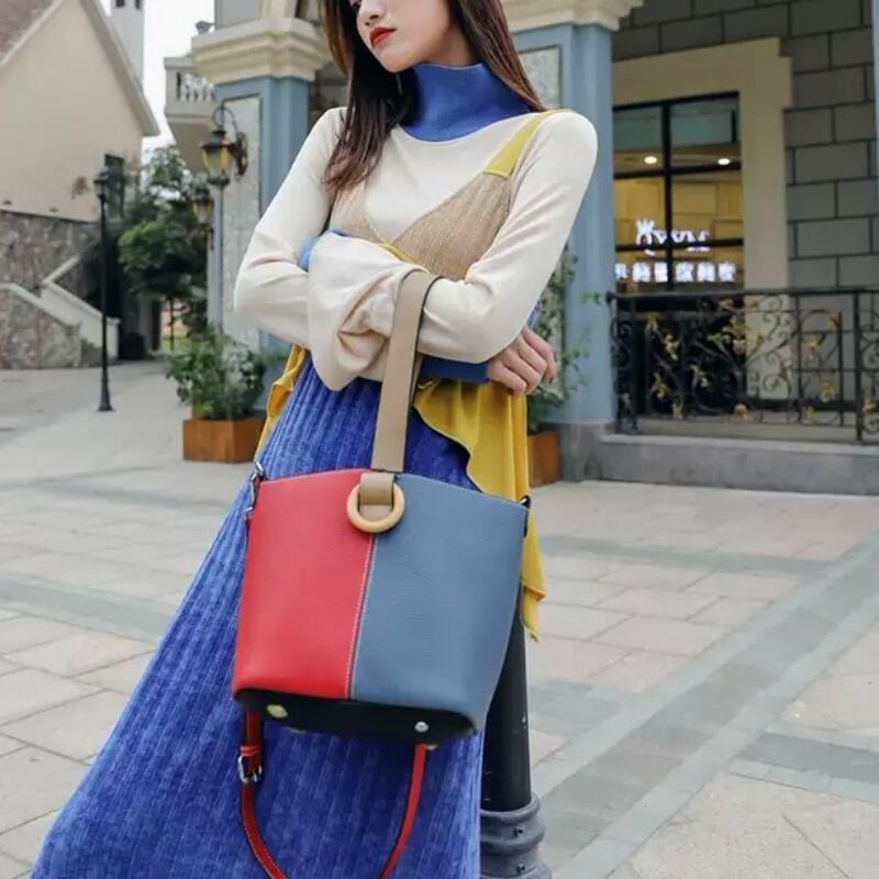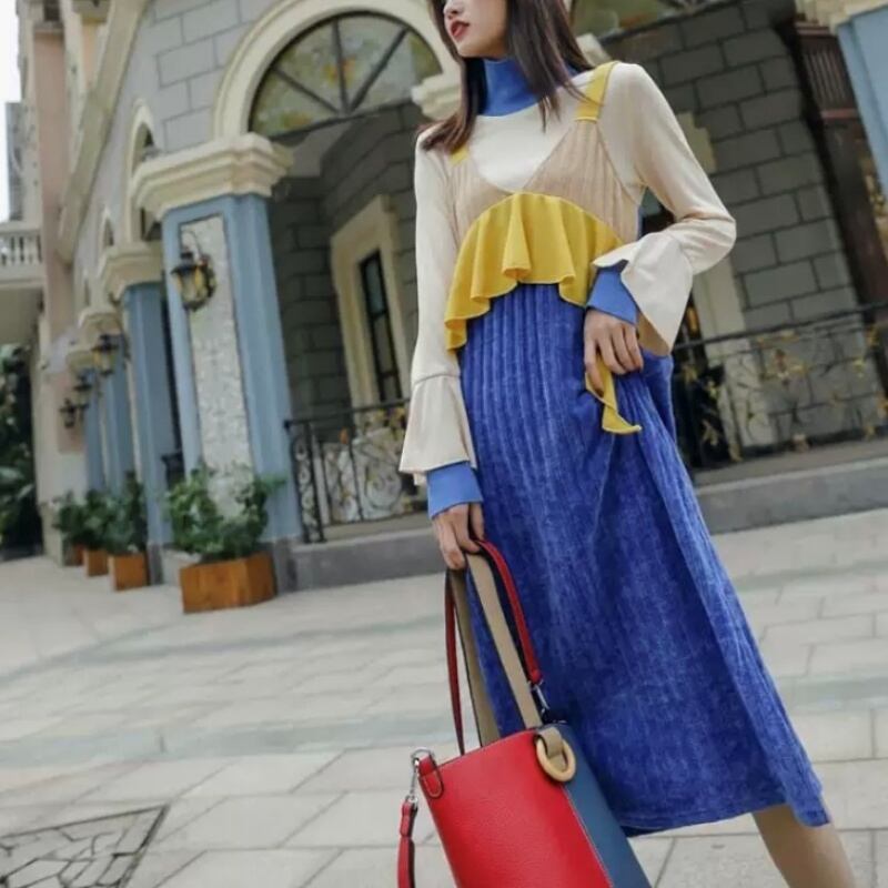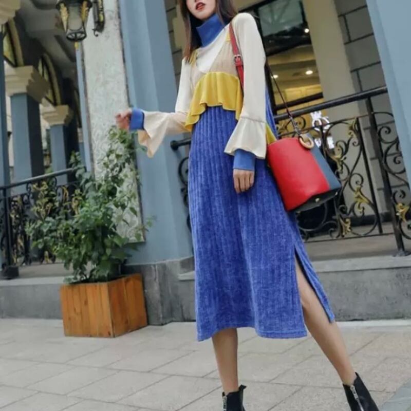 カラーブロック フリル タートルネック トップス スカート セットアップ *set027