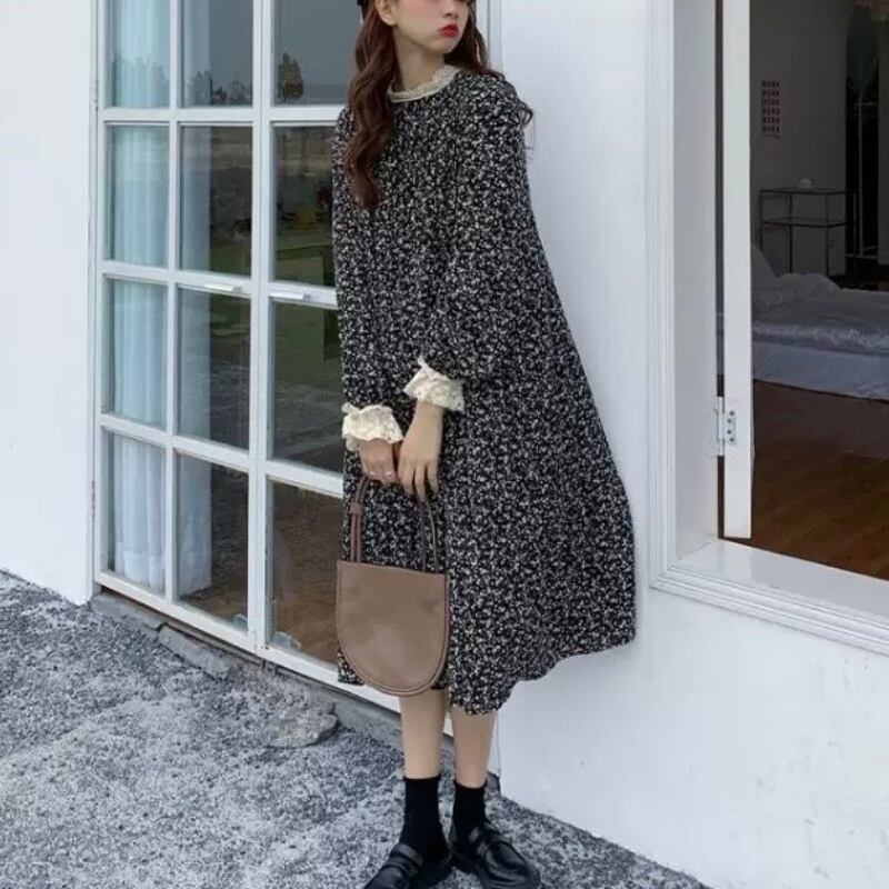 レトロ 花柄 レース 大人レディ かわいい 甘い 長袖 ミディアム ワンピース *on105