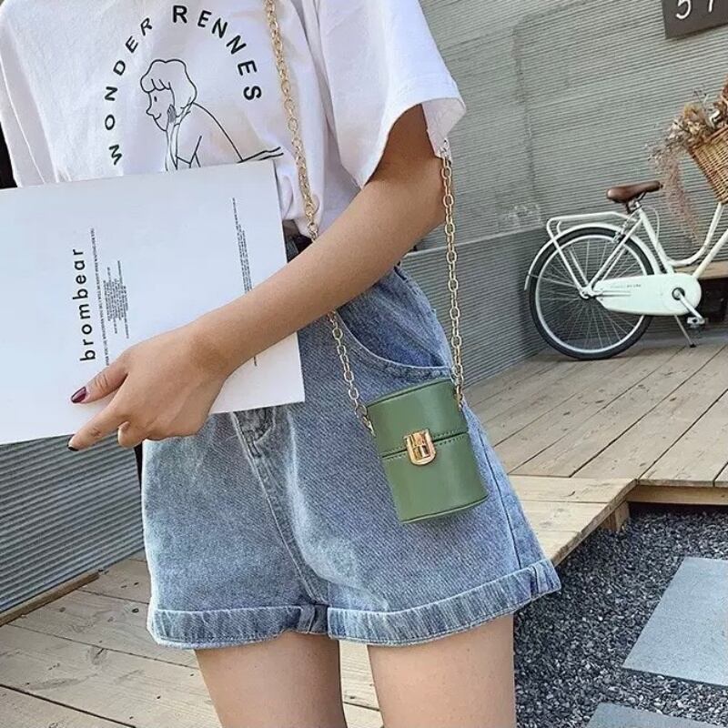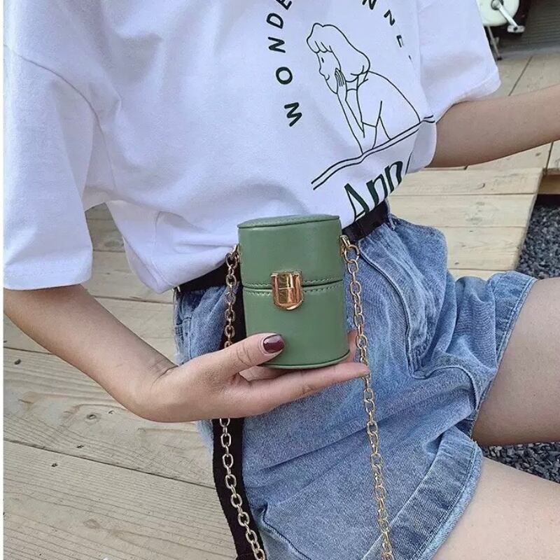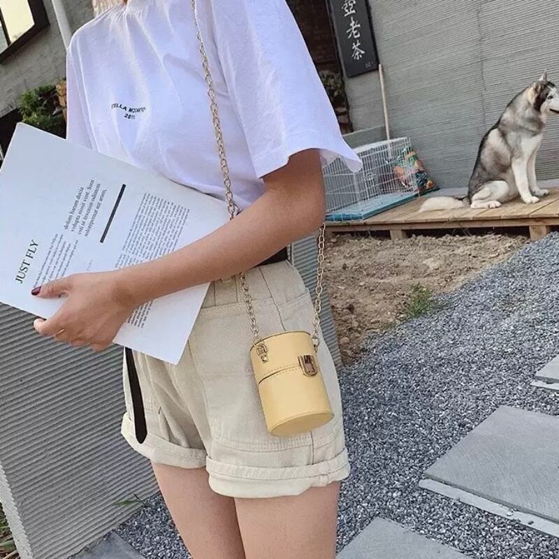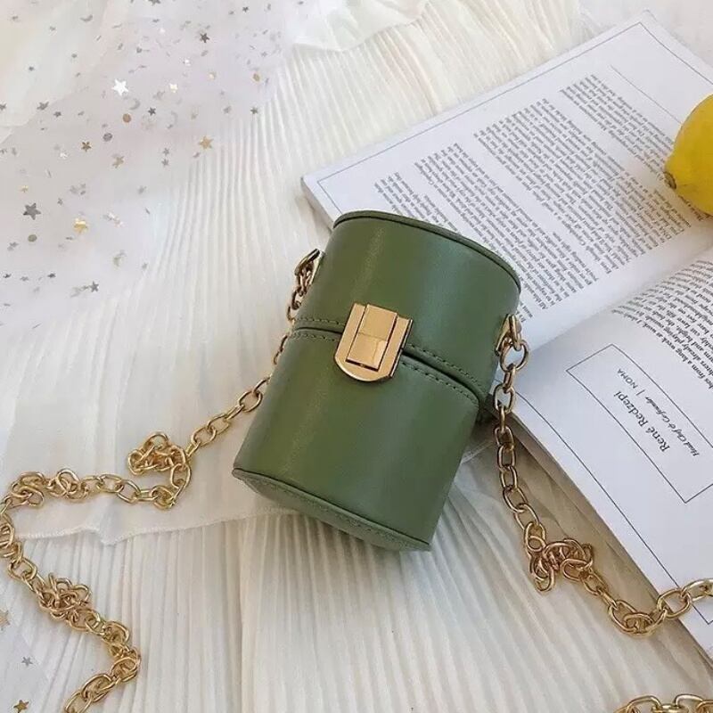 持ち運びしやすいサイズ感と円筒でコロンと安定感のあるショルダーバッグです。