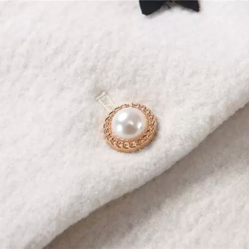パール調ボタンと黒リボンのWアクセントが目を惹くバイカラージャケットです。