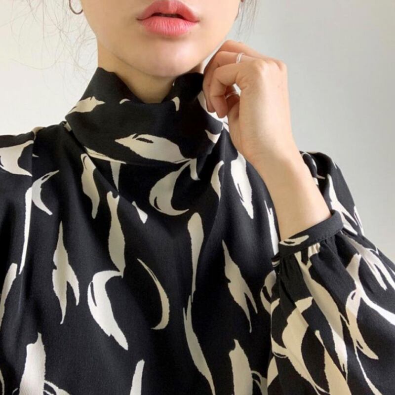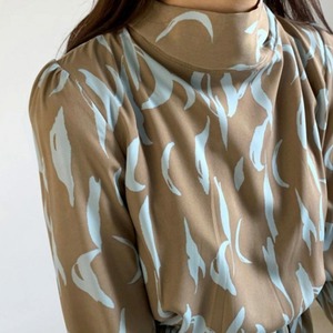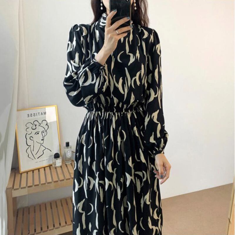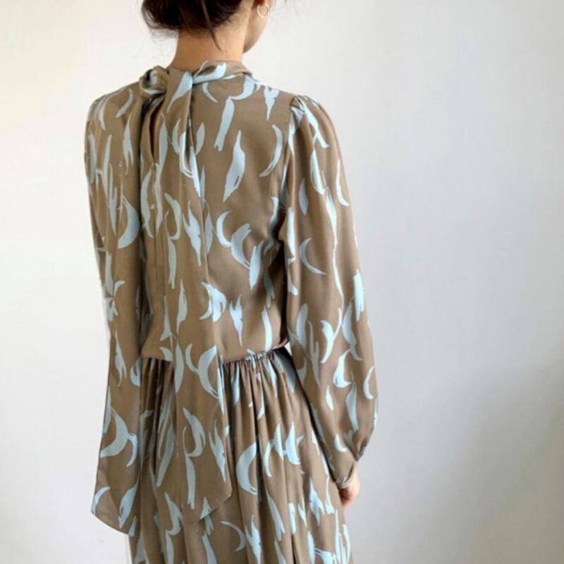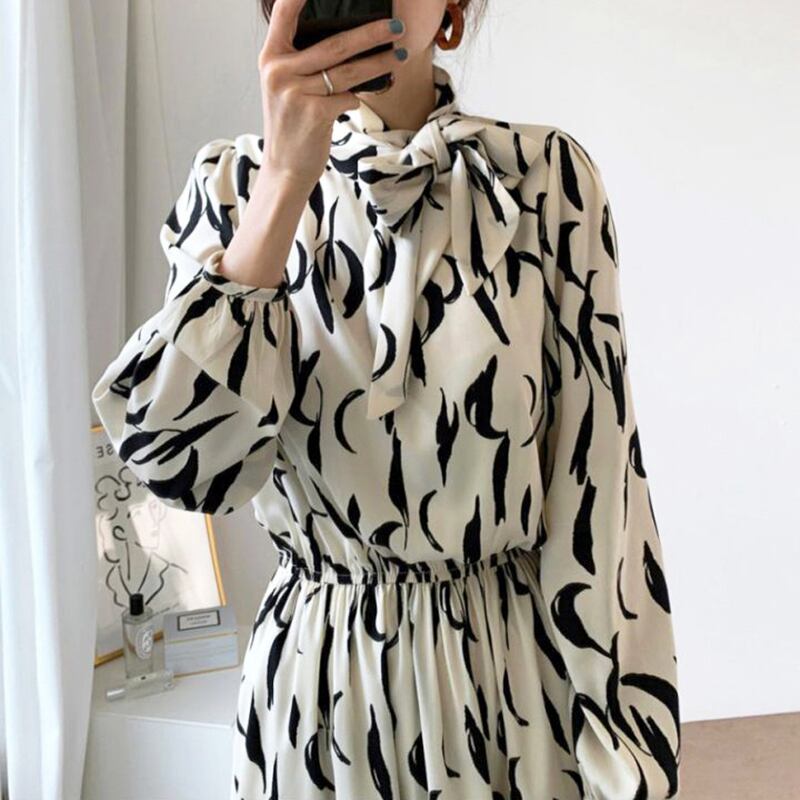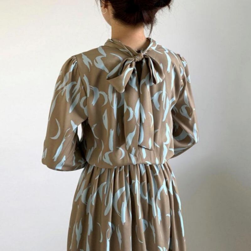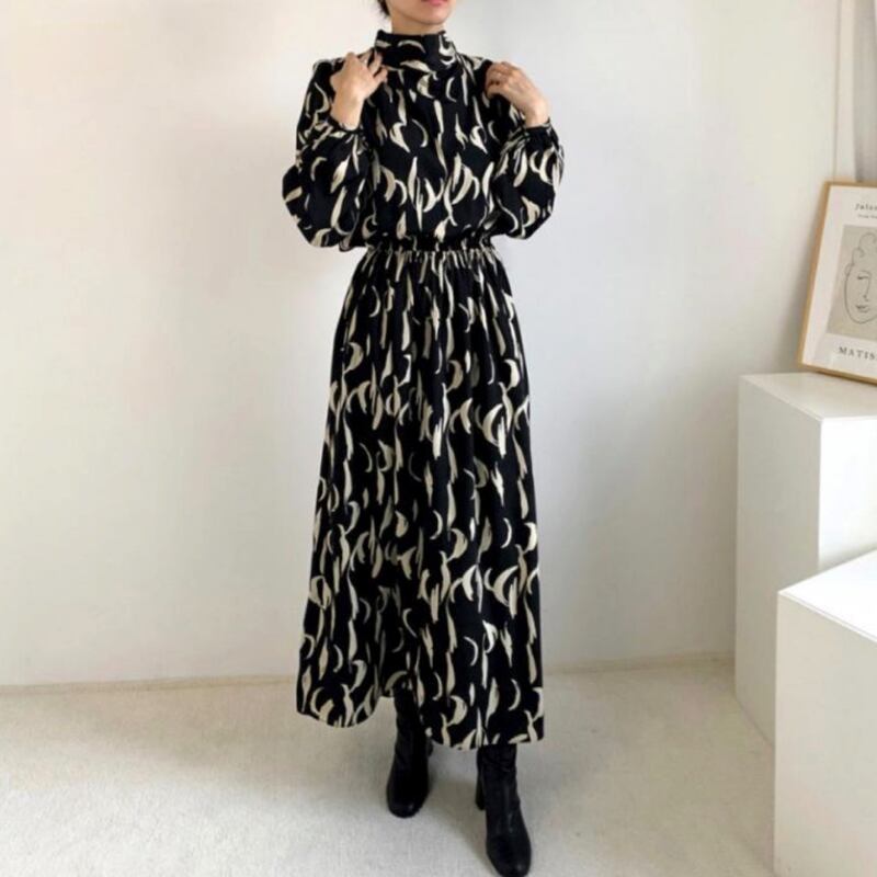 レトロ エレガント スタンドカラー リボンタイ 長袖 ミモレ丈 ワンピース *on116