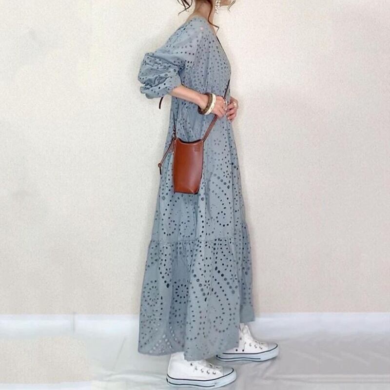 パンチングレース Vネック ボリューム袖 ロングワンピース *on118